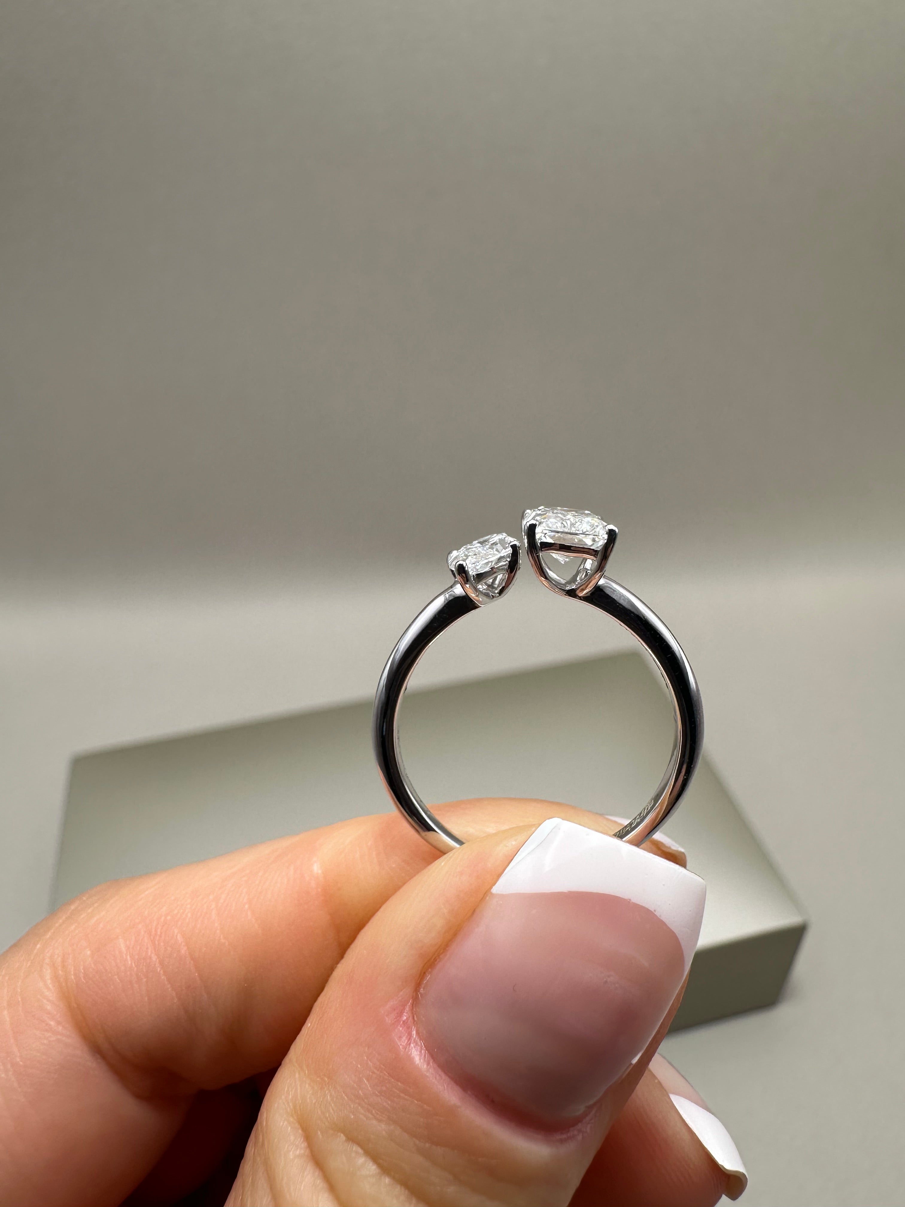Celebrate duality with this 18ct white gold Toi et Moi ring, featuring a stunning 0.92ct radiant-cut (E/VS2) and a 0.38ct marquise-cut (E/VVS1) lab-grown diamond, totalling 1.30ct. A sleek 1.80mm band supports the 9.50x7.60mm front design for a refined and romantic statement.