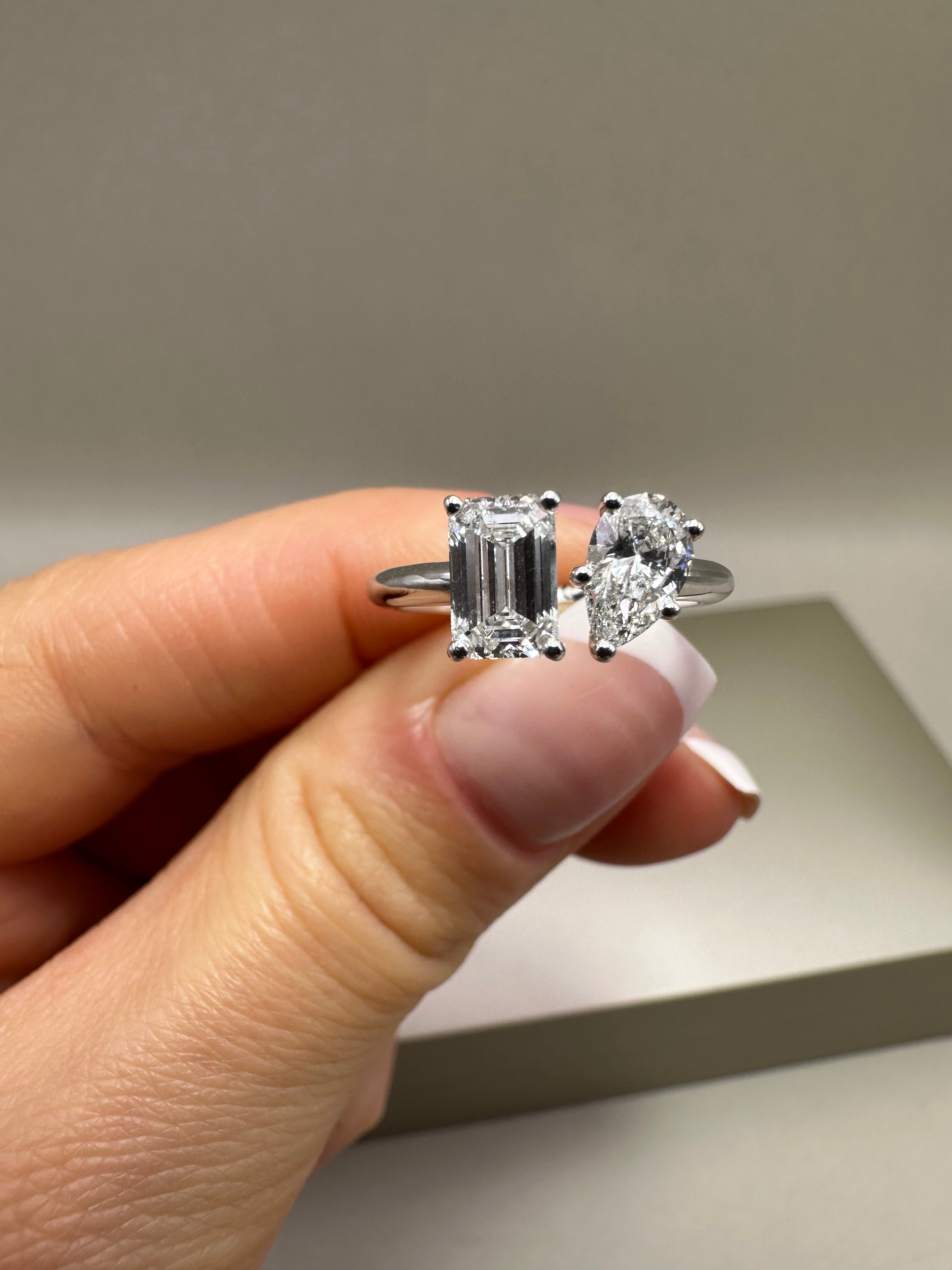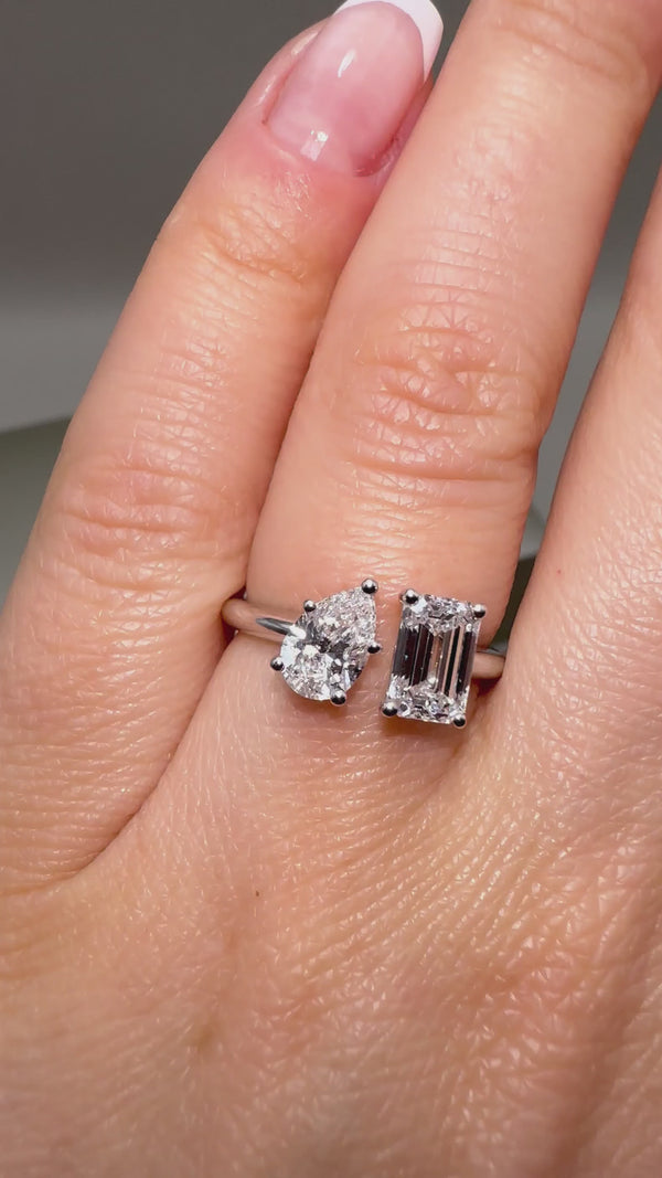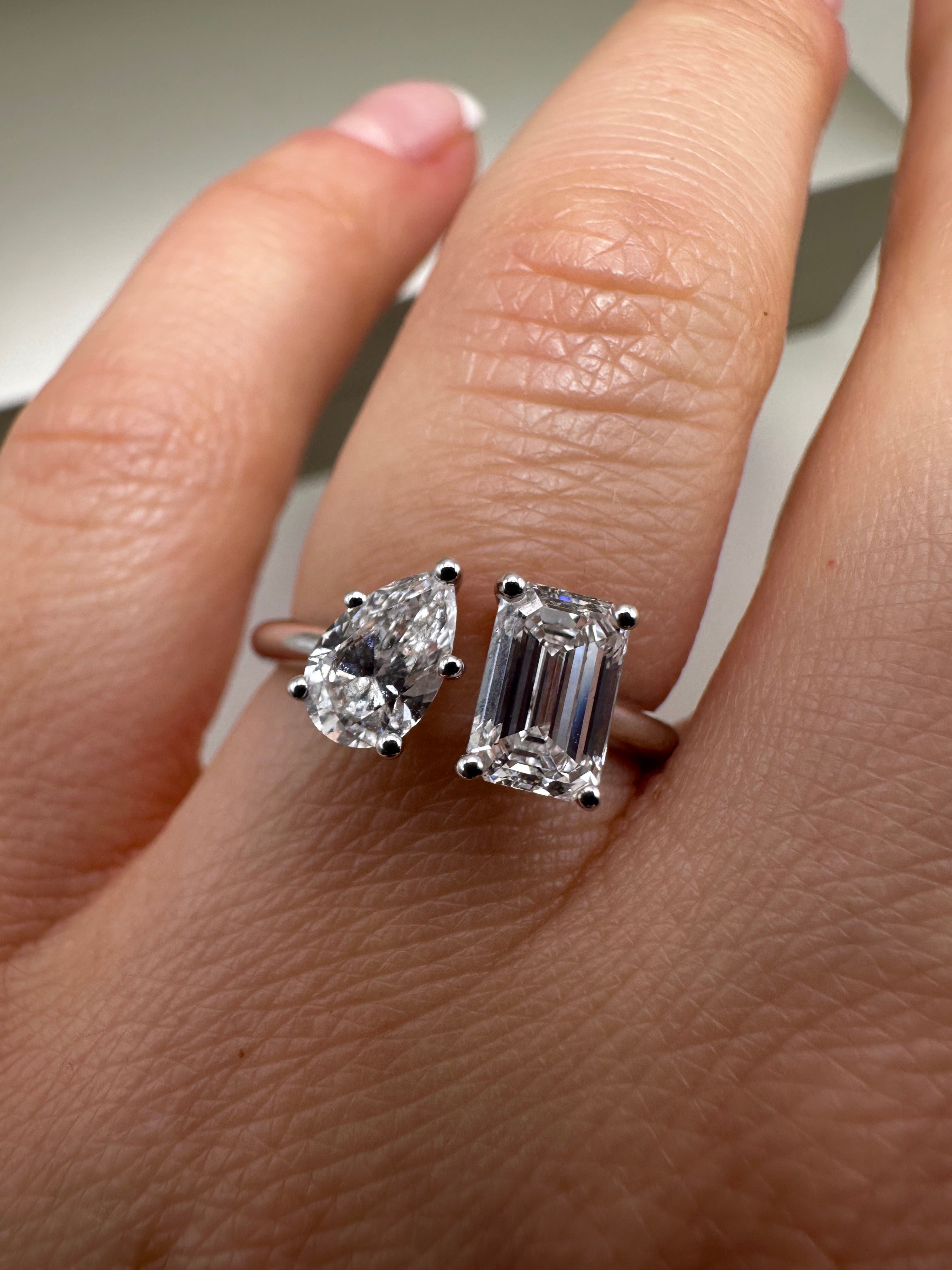 18ct White Gold Toi et Moi Ring – 1.45ct Lab-Grown Emerald Cut & Pear Diamonds | Elegant Fancy Design