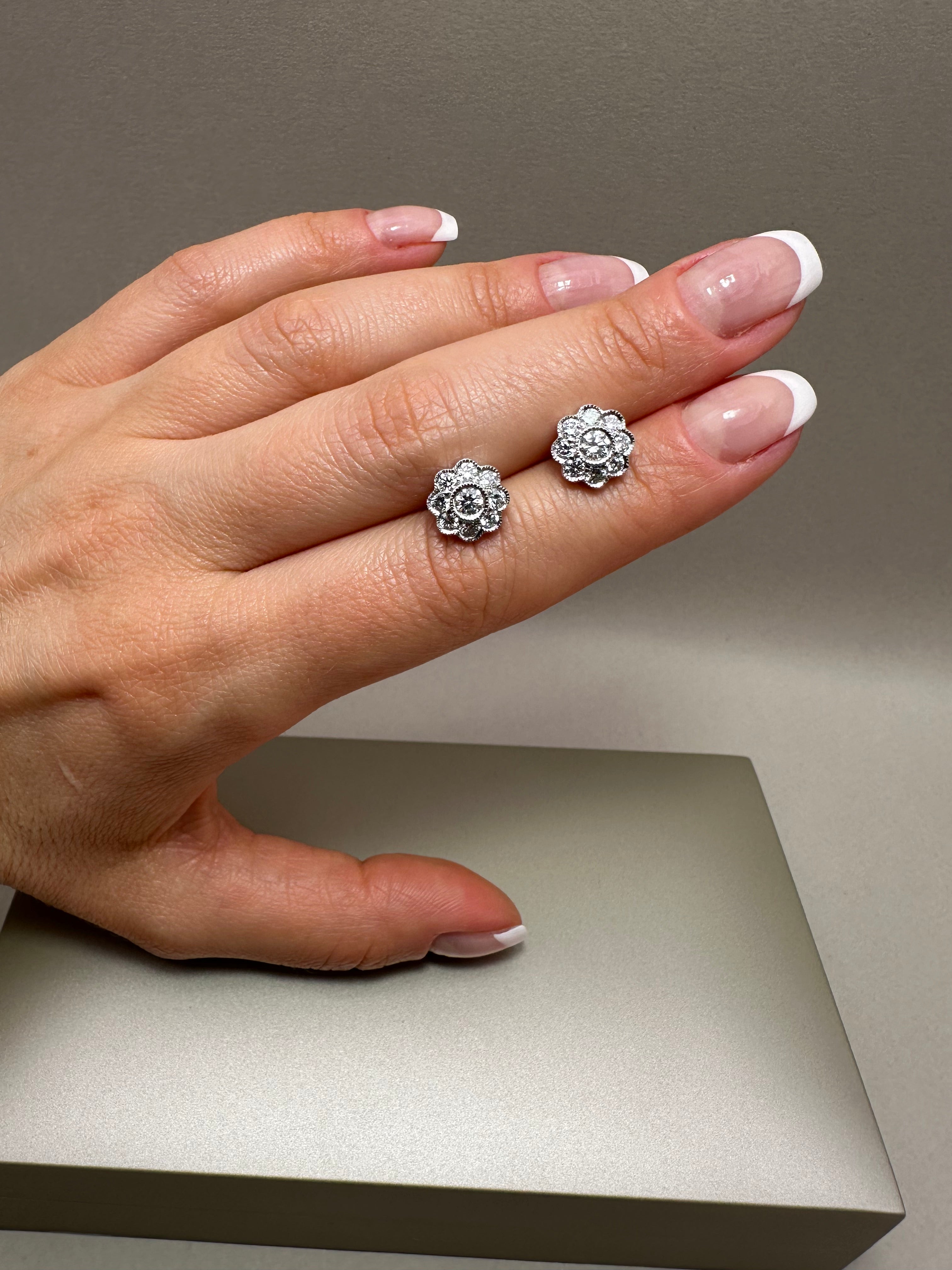 Elegant 9ct white gold daisy cluster stud earrings featuring 1.01ct lab-grown round diamonds (E/F-VS quality) with a delicate filigree finish. Measuring approx. 9.3x9.3mm and 2.7mm deep, these sustainable diamond earrings combine timeless style with everyday elegance.