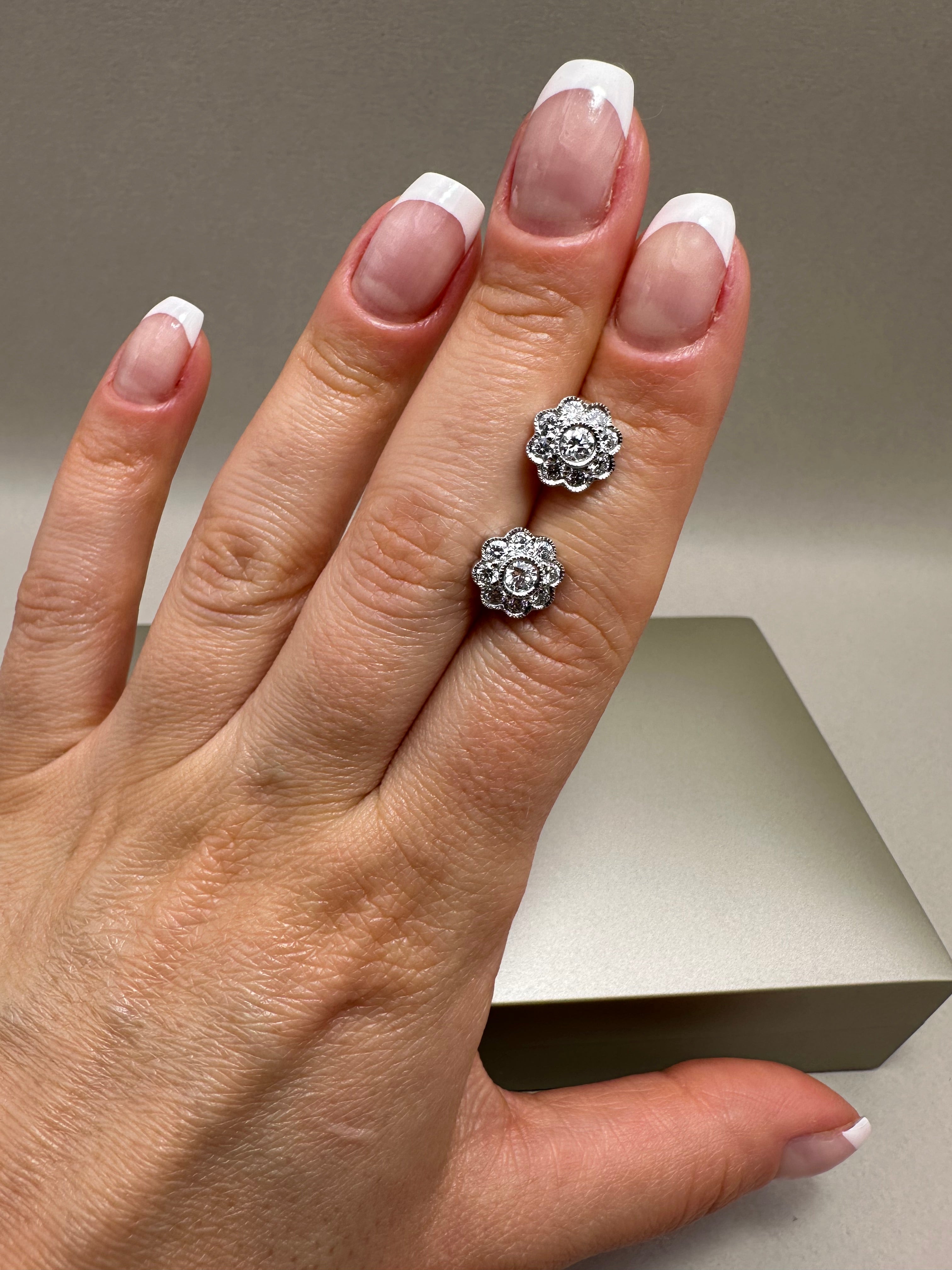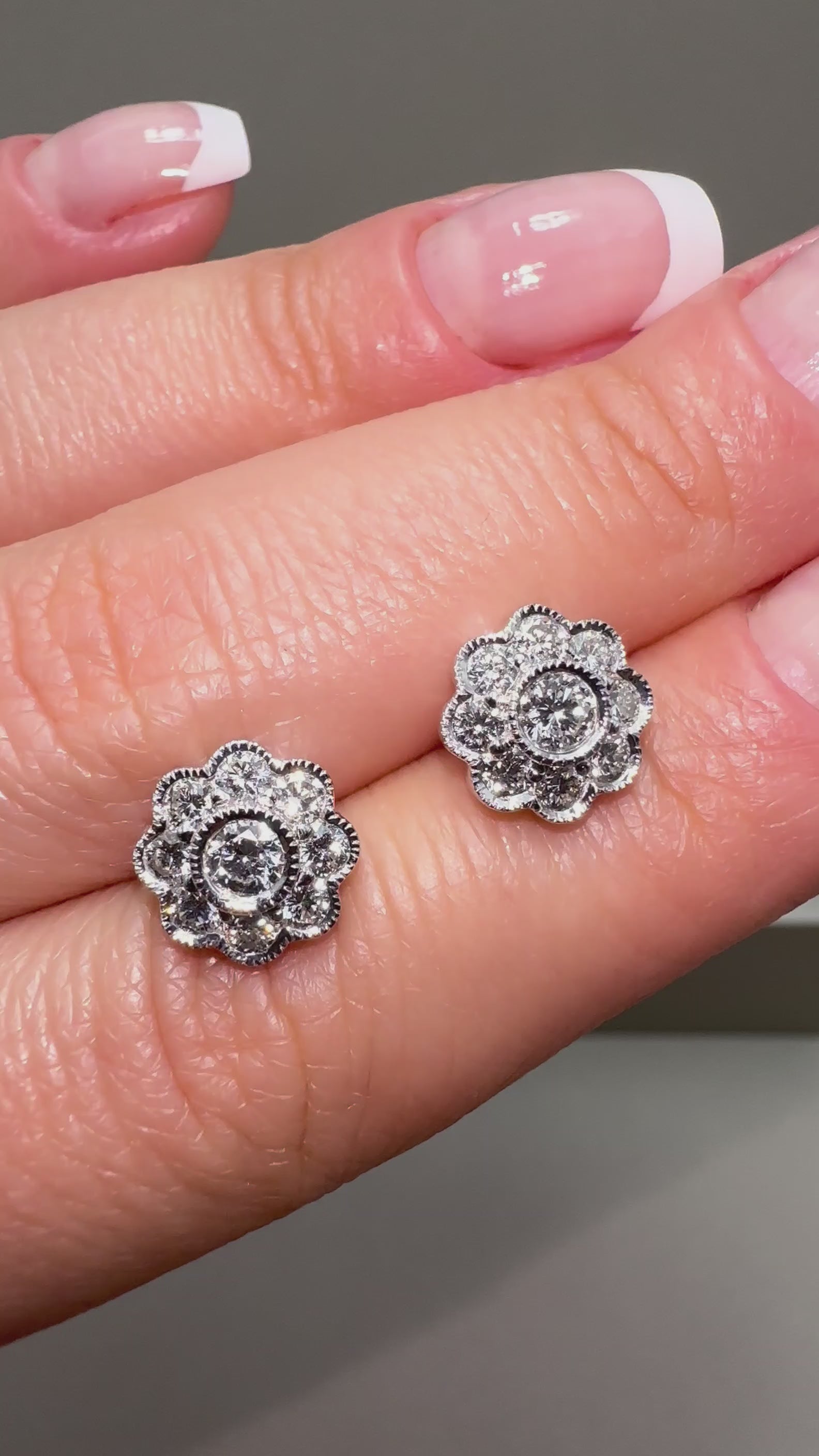 9ct White Gold Daisy Cluster Stud Earrings | 1.01ct Lab-Grown Diamonds, Filigree Finish