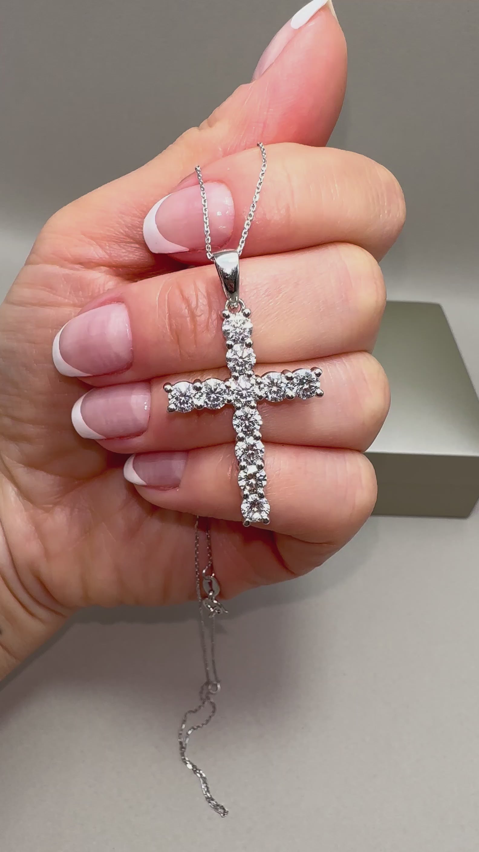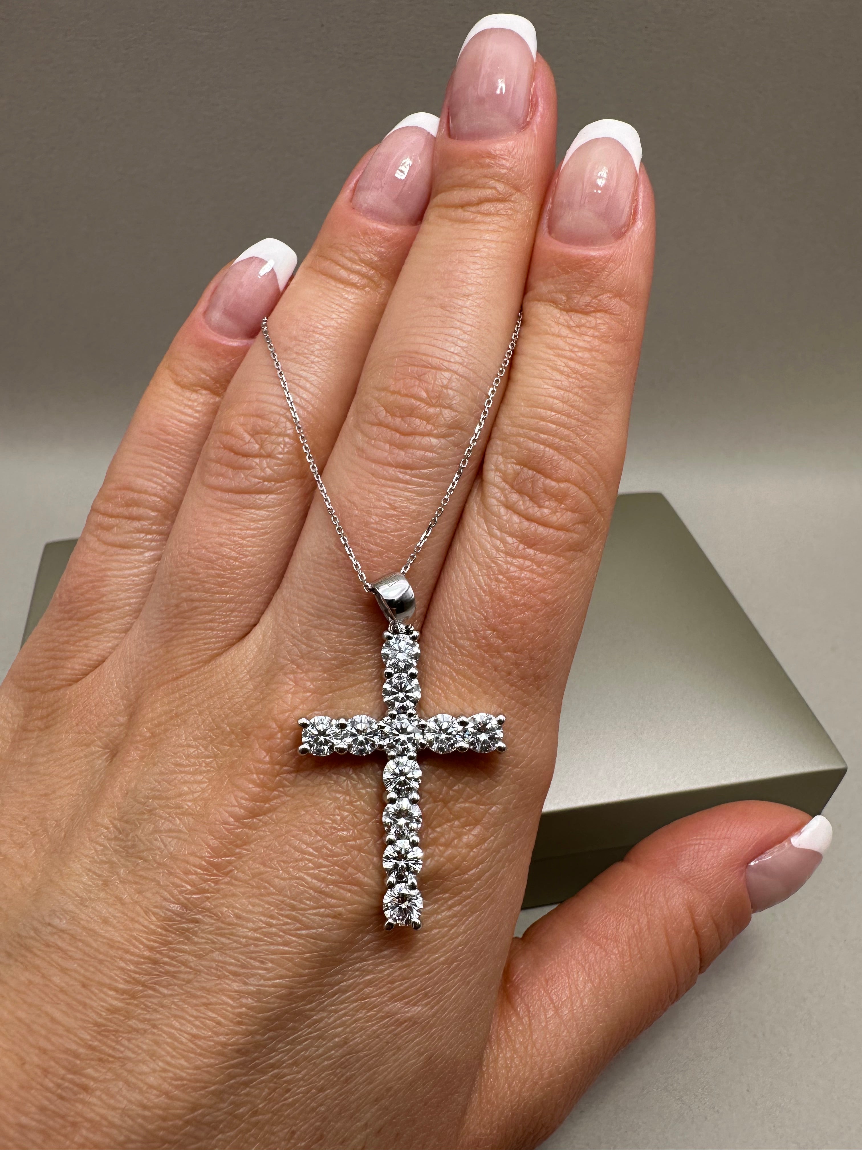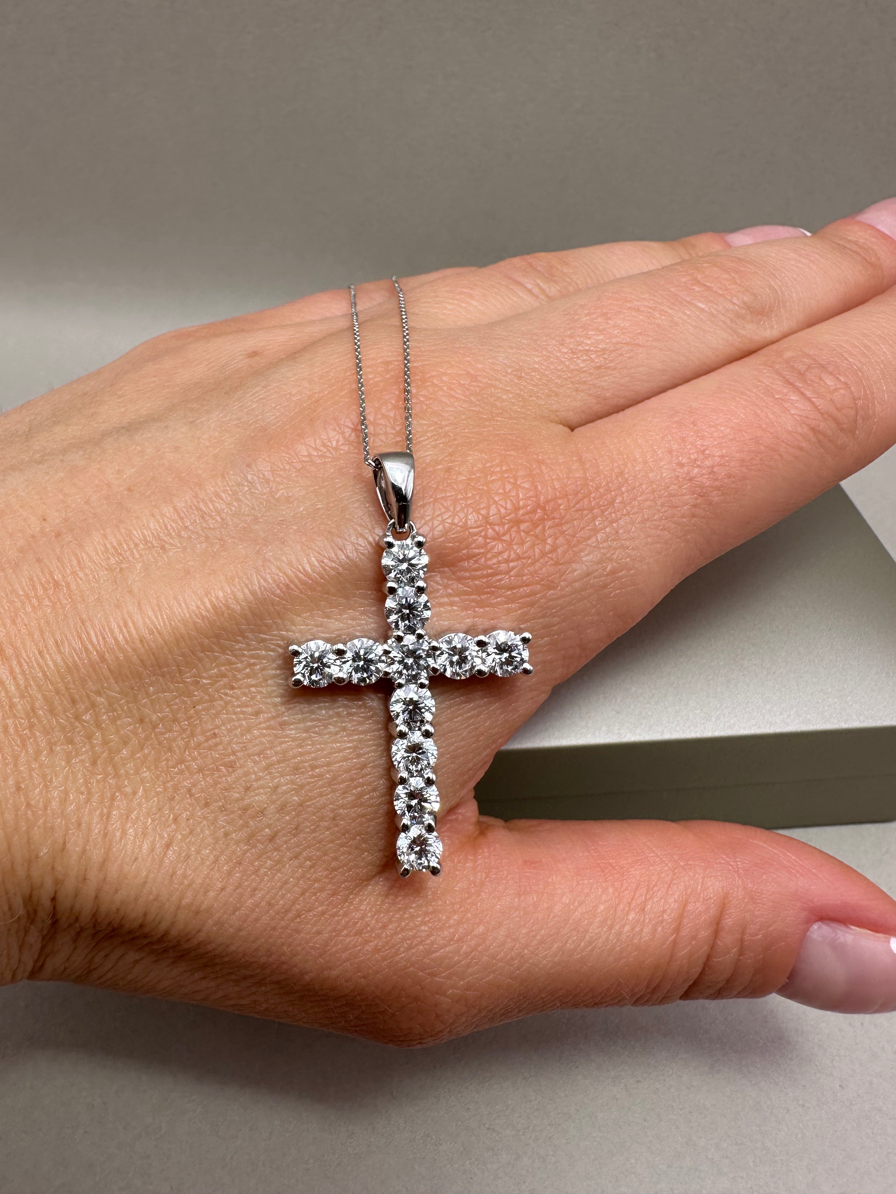 Striking 9ct white gold cross pendant set with 3.42ct lab-grown round diamonds (E/F-VS quality). Comes with a 0.40mm fine gold chain featuring adjustable 16"-18" length. Cross measures approx. 21x30mm, total drop 40mm, depth 3.40mm. A modern, ethical luxury piece.