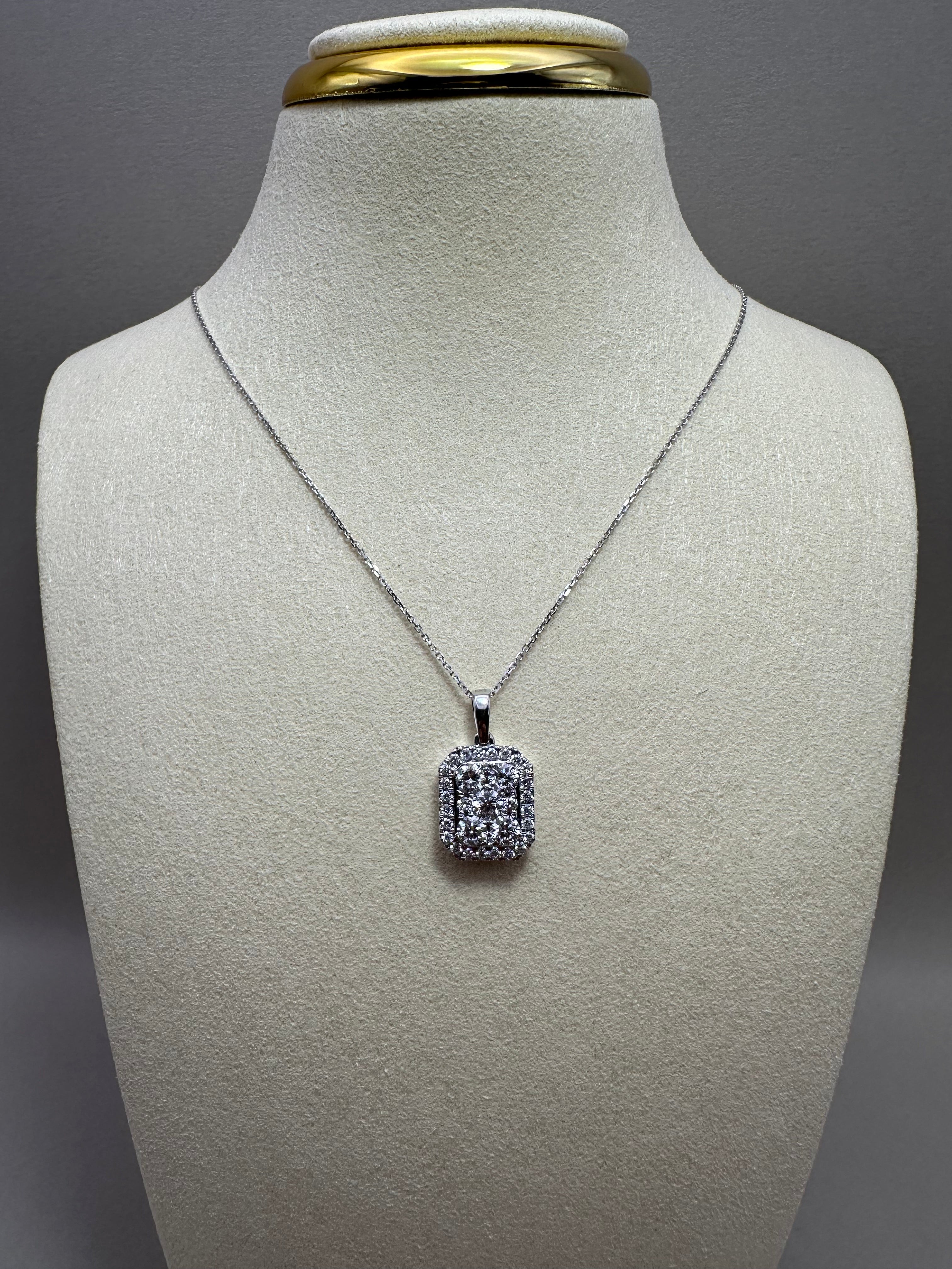 Stunning 9ct white gold halo pendant featuring 1.04ct lab-grown round diamonds (E/F-VS quality) in a brilliant illusion setting. Comes with a 0.40mm fine white gold chain, adjustable between 16" and 18". Pendant approx. 12.5x10.5mm, drop 20mm, depth 4.30mm. Refined luxury with sustainable sparkle.