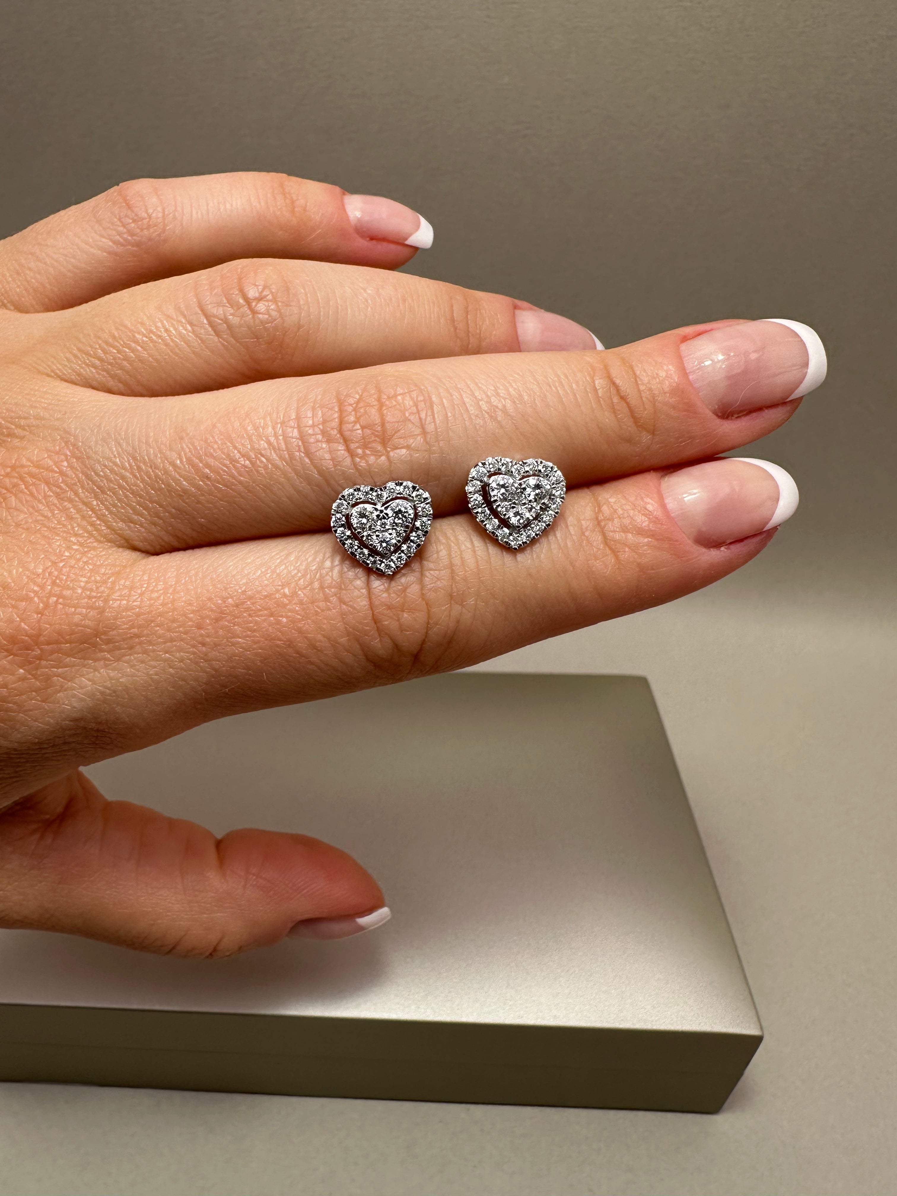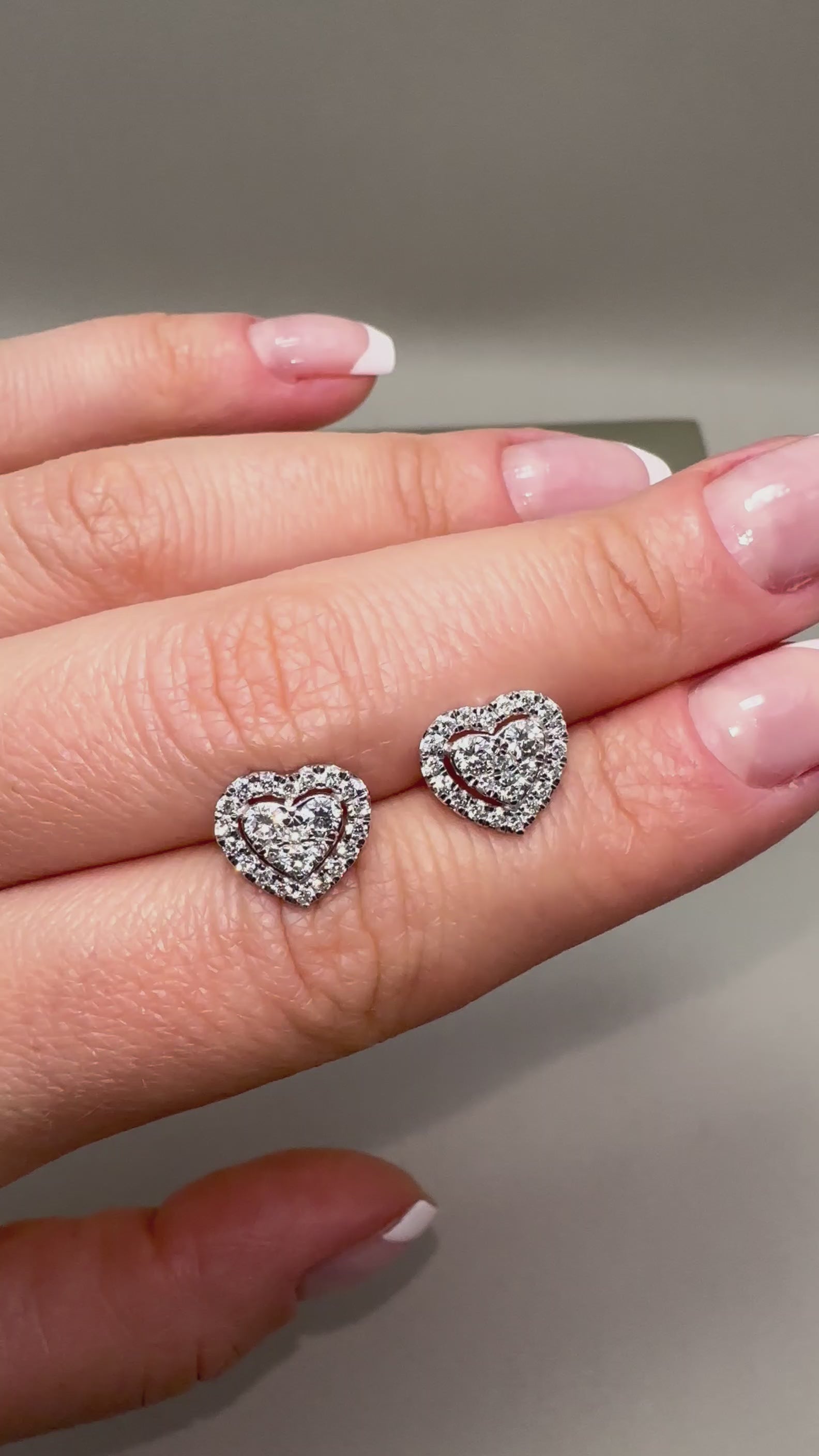 Delicate and dazzling 9ct white gold heart-shaped stud earrings featuring 0.75ct lab-grown round diamonds (E/F-VS quality) in a refined halo setting. Earring size approx. 10x9mm, depth 1.70mm. Ethical sparkle meets timeless romance.