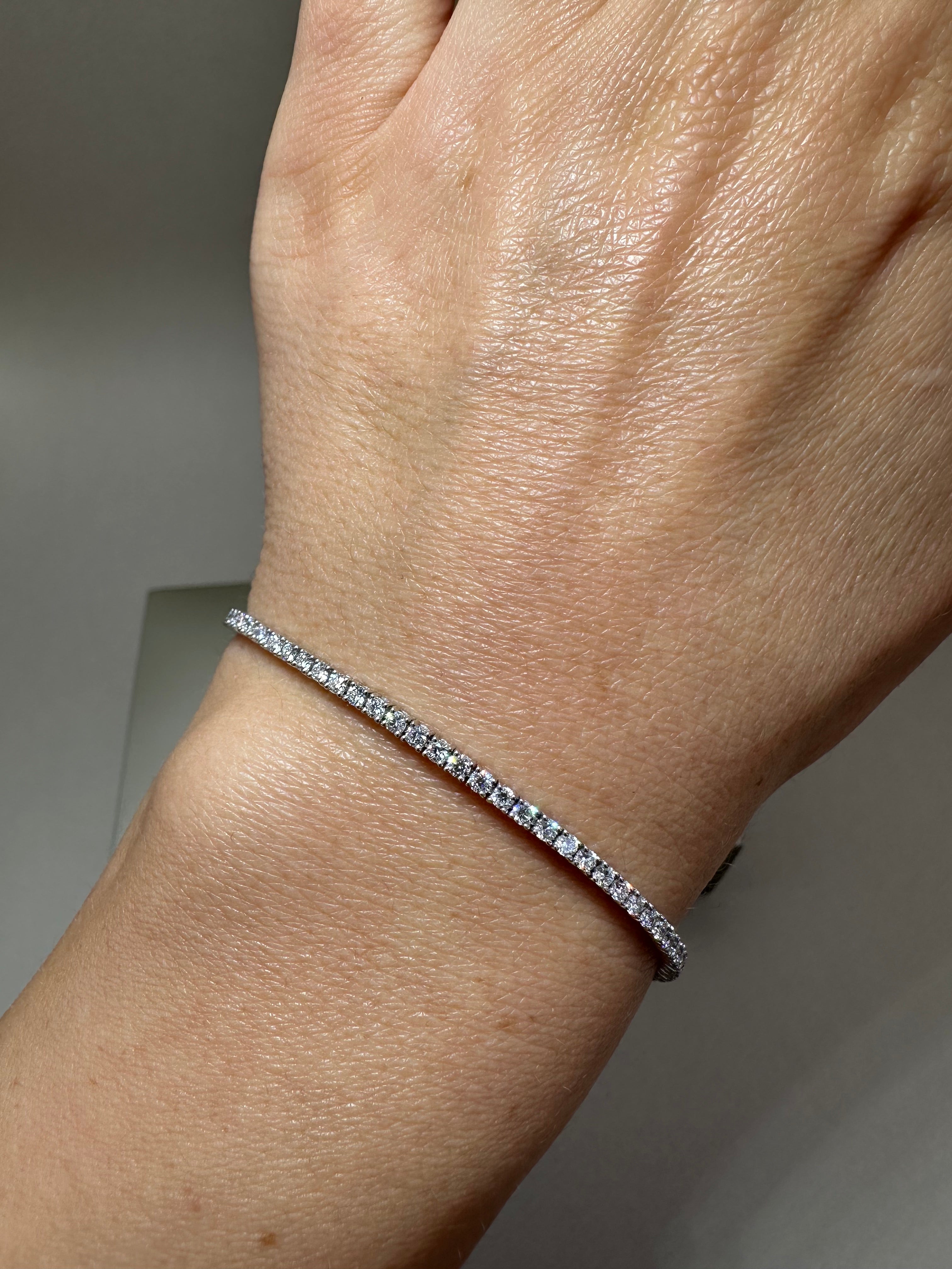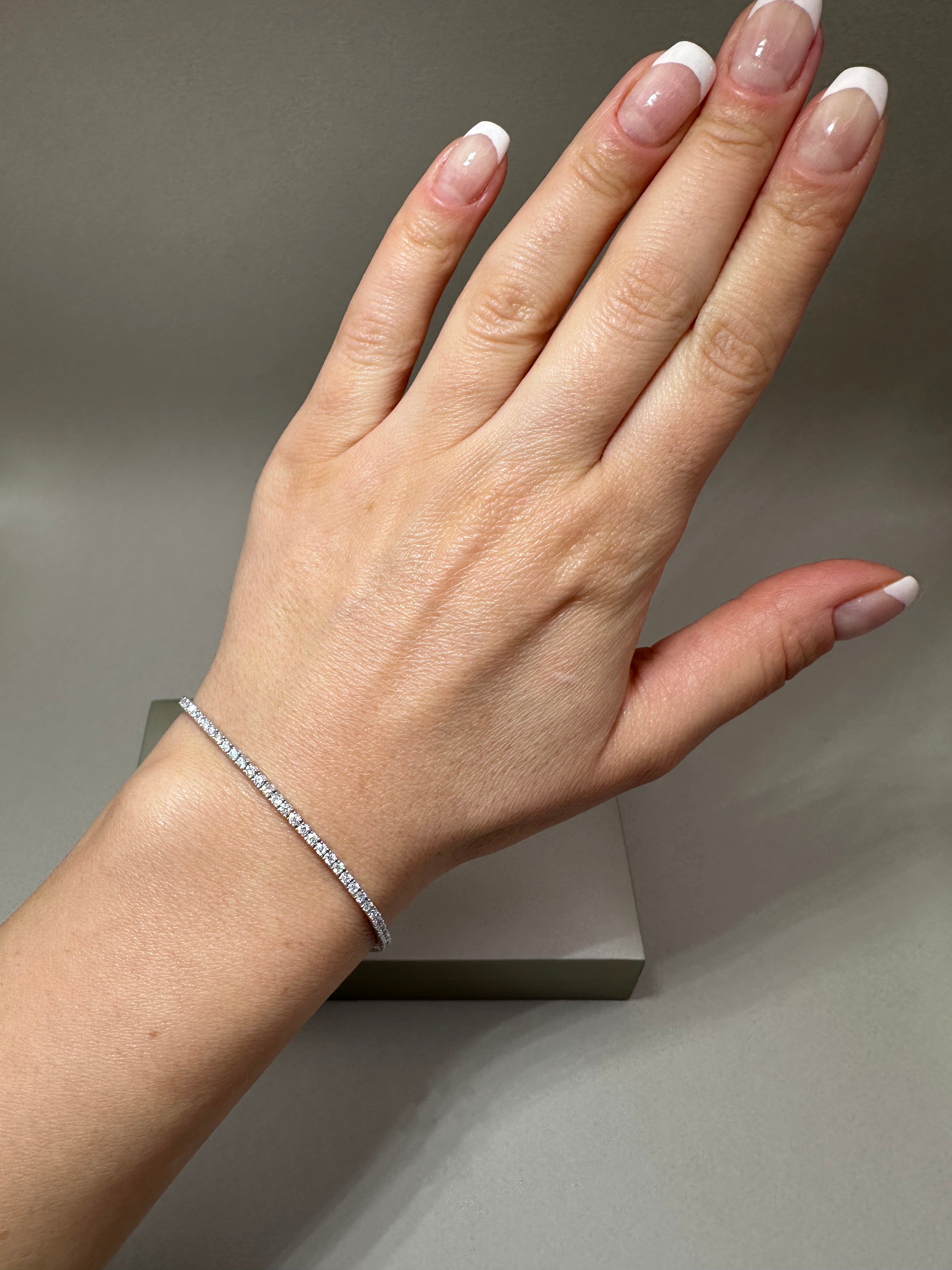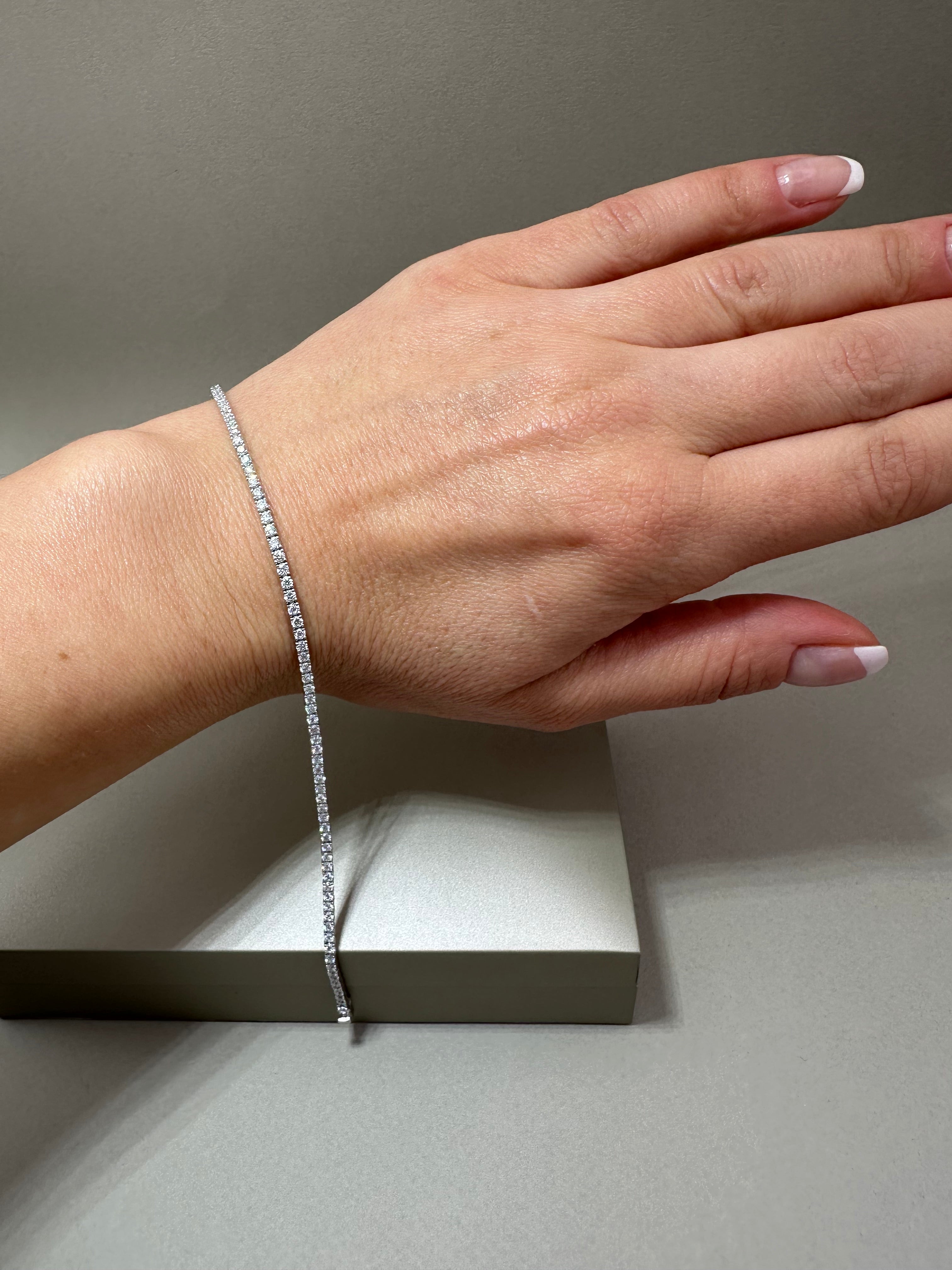 Beautiful 9ct white gold classic tennis bracelet featuring 2.13ct lab-grown round cut diamonds. This ethically made, sustainable bracelet offers a delicate 1.8mm band width and approx. 7" length. Perfect for fine jewellery collections, special occasions, or everyday elegance.