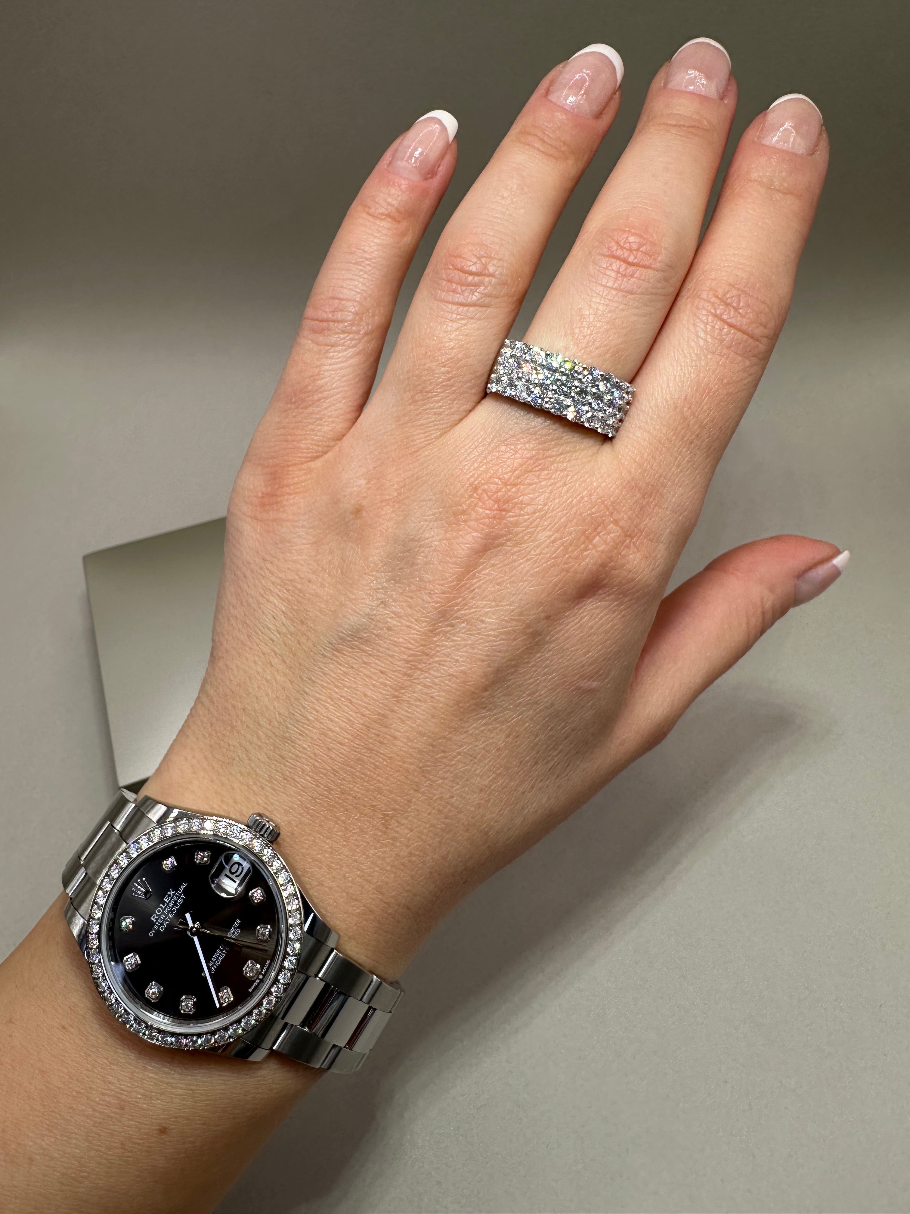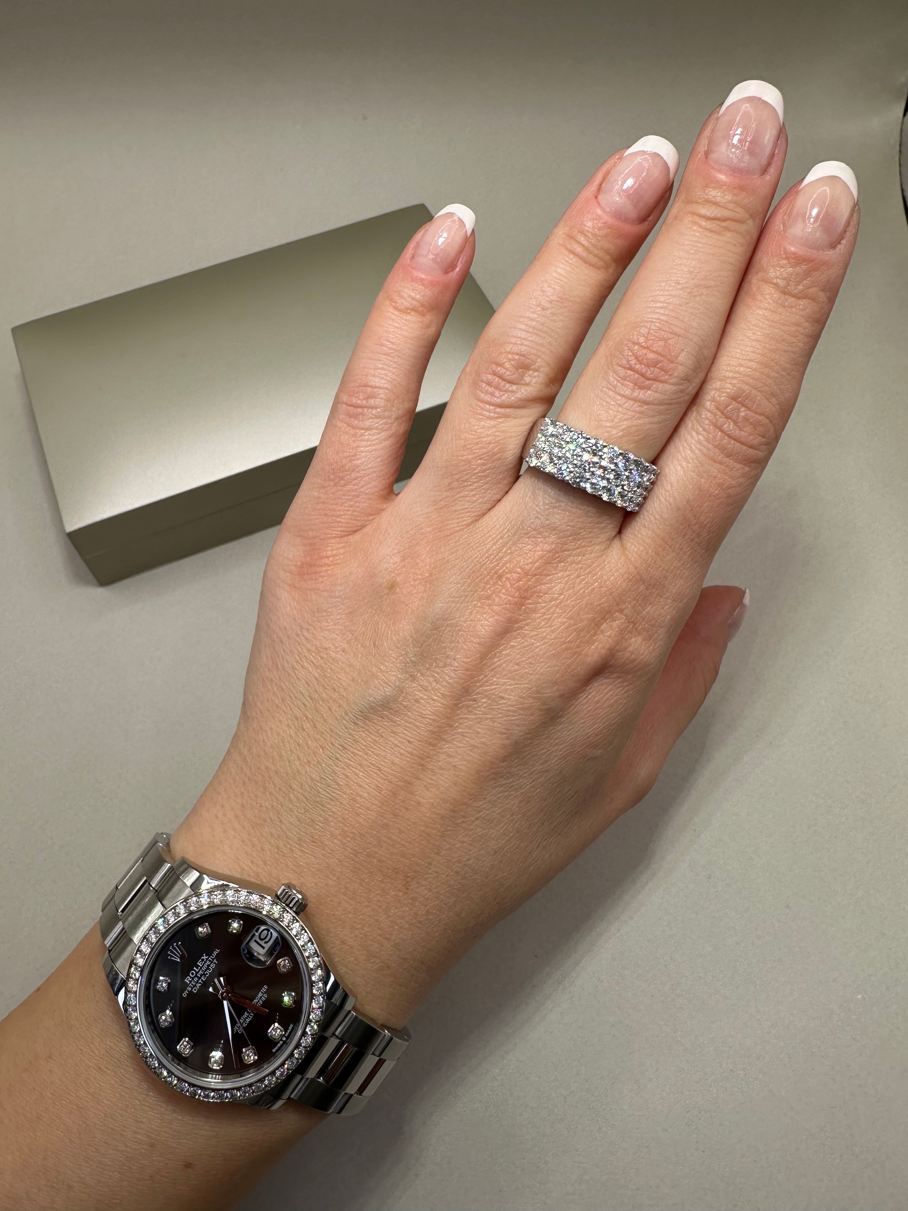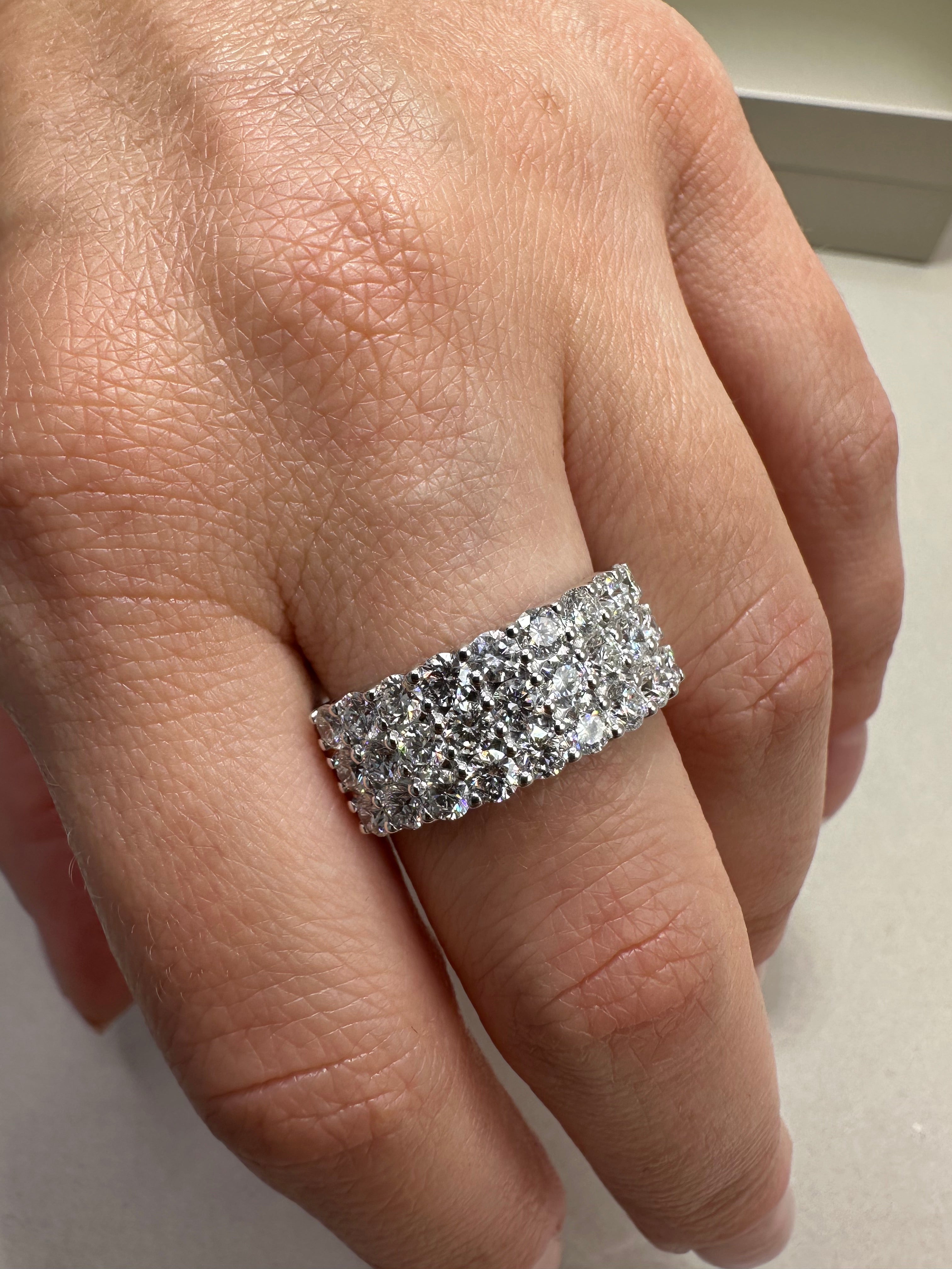 Stunning 9ct white gold eternity dress ring featuring 2.21ct of lab-grown round cut diamonds set in three elegant rows. Crafted with premium E/F colour and VS clarity diamonds, this ring offers exceptional brilliance and sophistication. The band width measures approximately 8.40mm at its widest point, making it a perfect statement piece for any occasion.