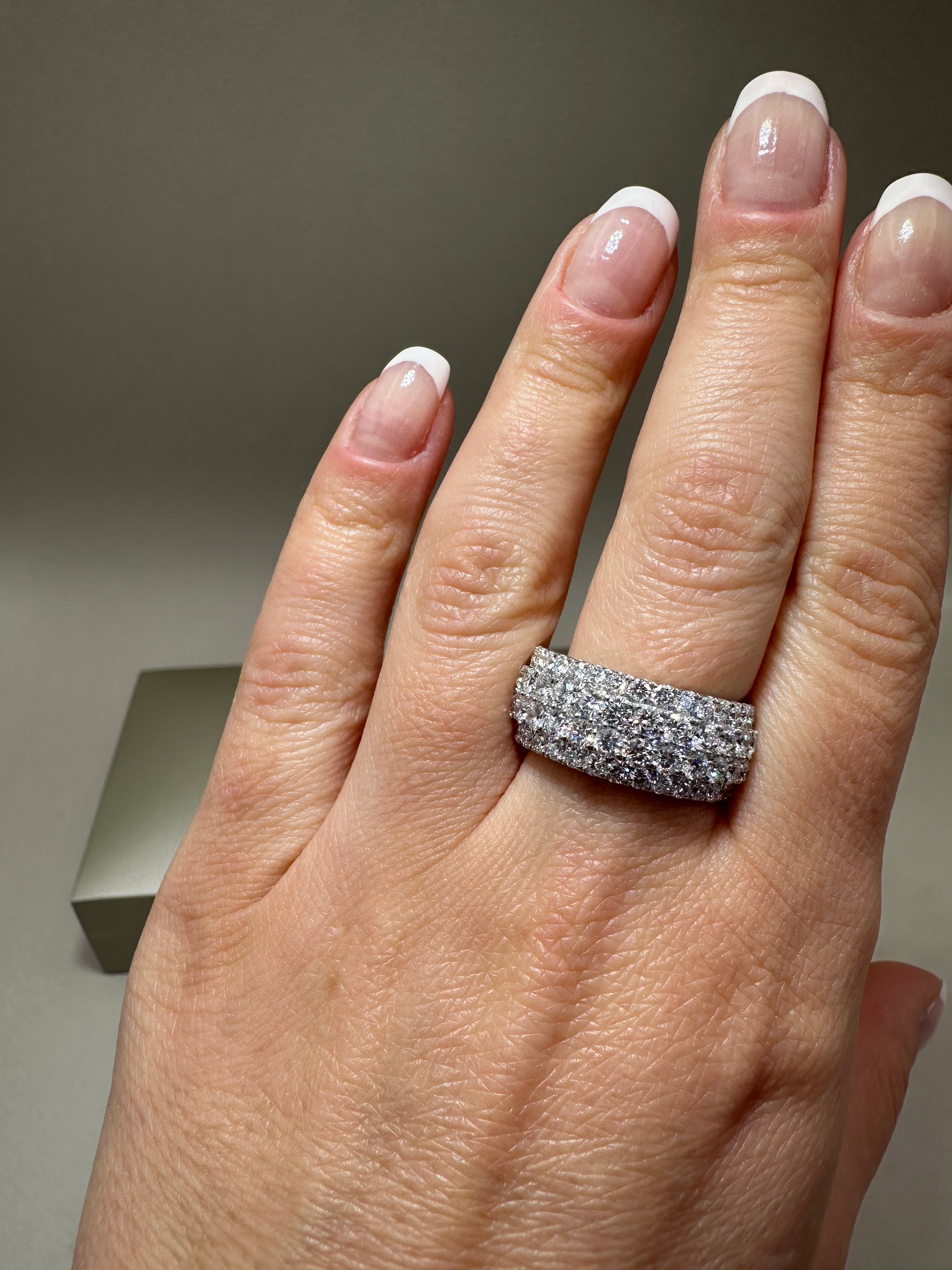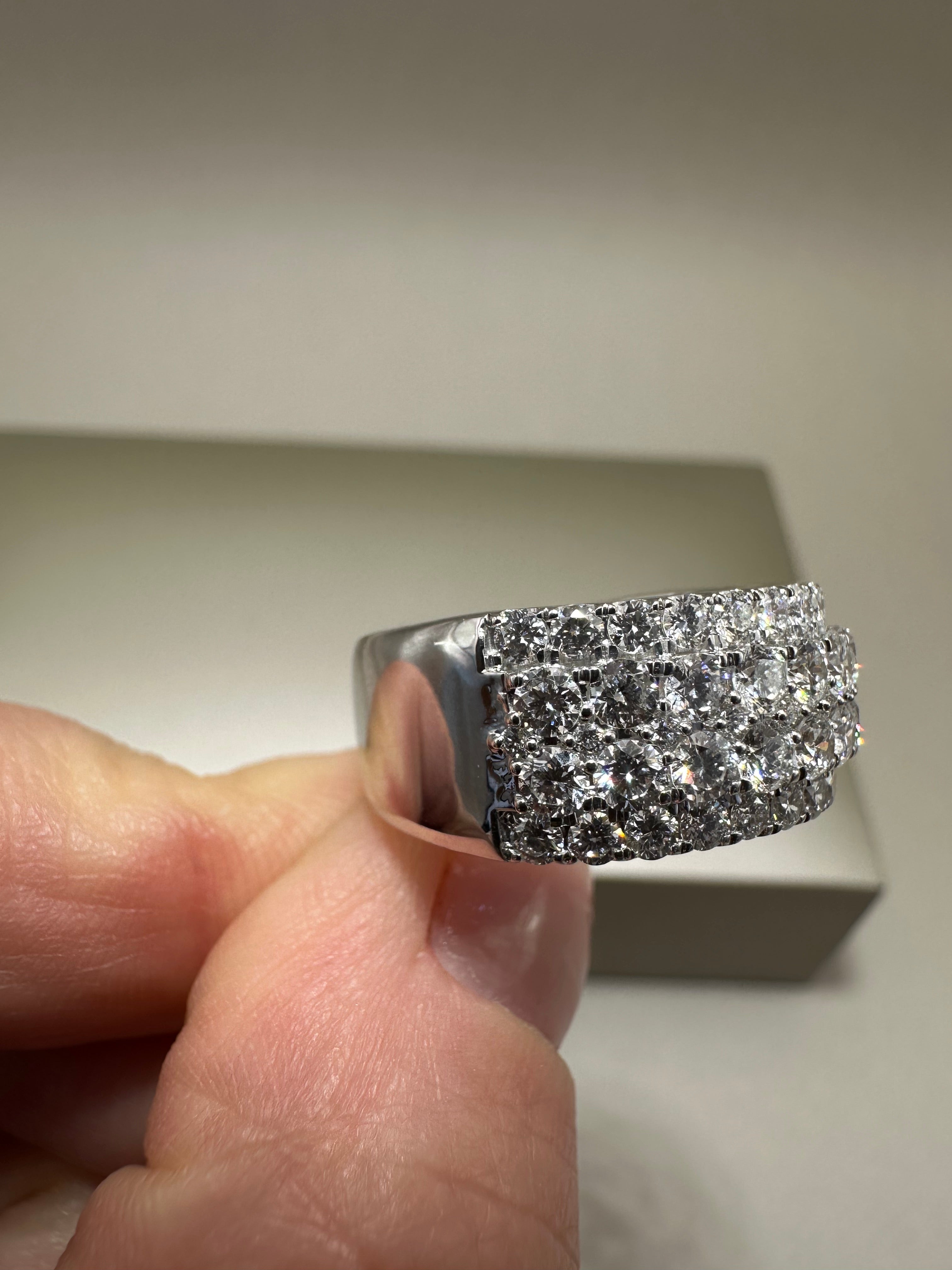 Exquisite 9ct white gold eternity dress ring showcasing 2.48ct of brilliant lab-grown round cut diamonds set in four rows. This ethically sourced, sustainable diamond ring features a wide 9.50mm band, perfect for luxury stacking or as a statement piece. Ideal for engagement, anniversary, or special occasions, this lab-grown diamond eternity ring offers exceptional sparkle and timeless elegance.