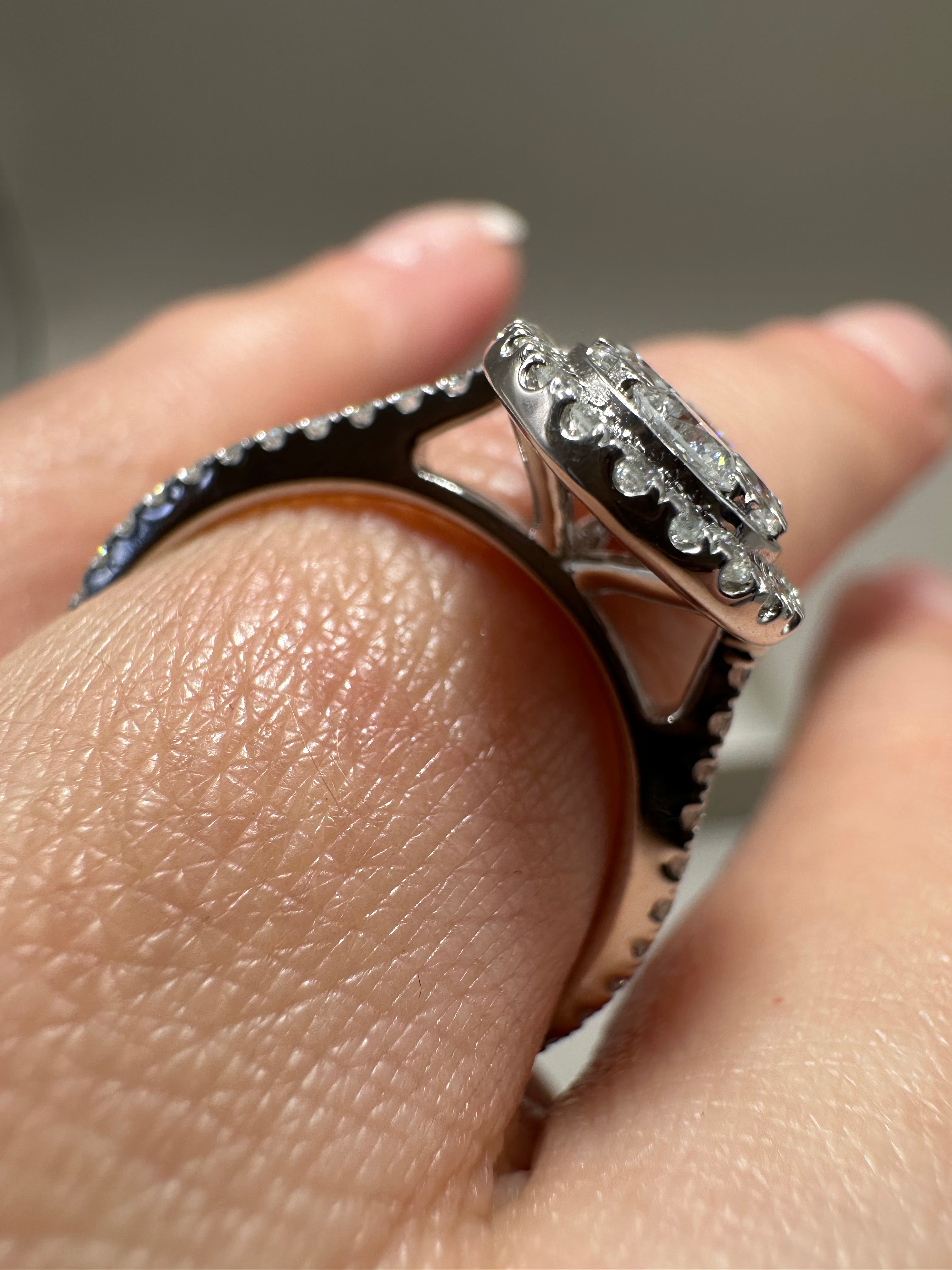 An elegant 9ct white gold halo ring featuring 1.04ct of lab-grown round cut diamonds set in an illusion setting. Crafted with E/F colour and VS clarity diamonds, this sustainable and ethically made piece showcases a stunning pear-shaped design measuring approximately 14.00 x 10.50mm. The delicate 1.5mm band adds refined sophistication, making it a perfect choice for fine jewellery lovers seeking timeless style with ethical values.