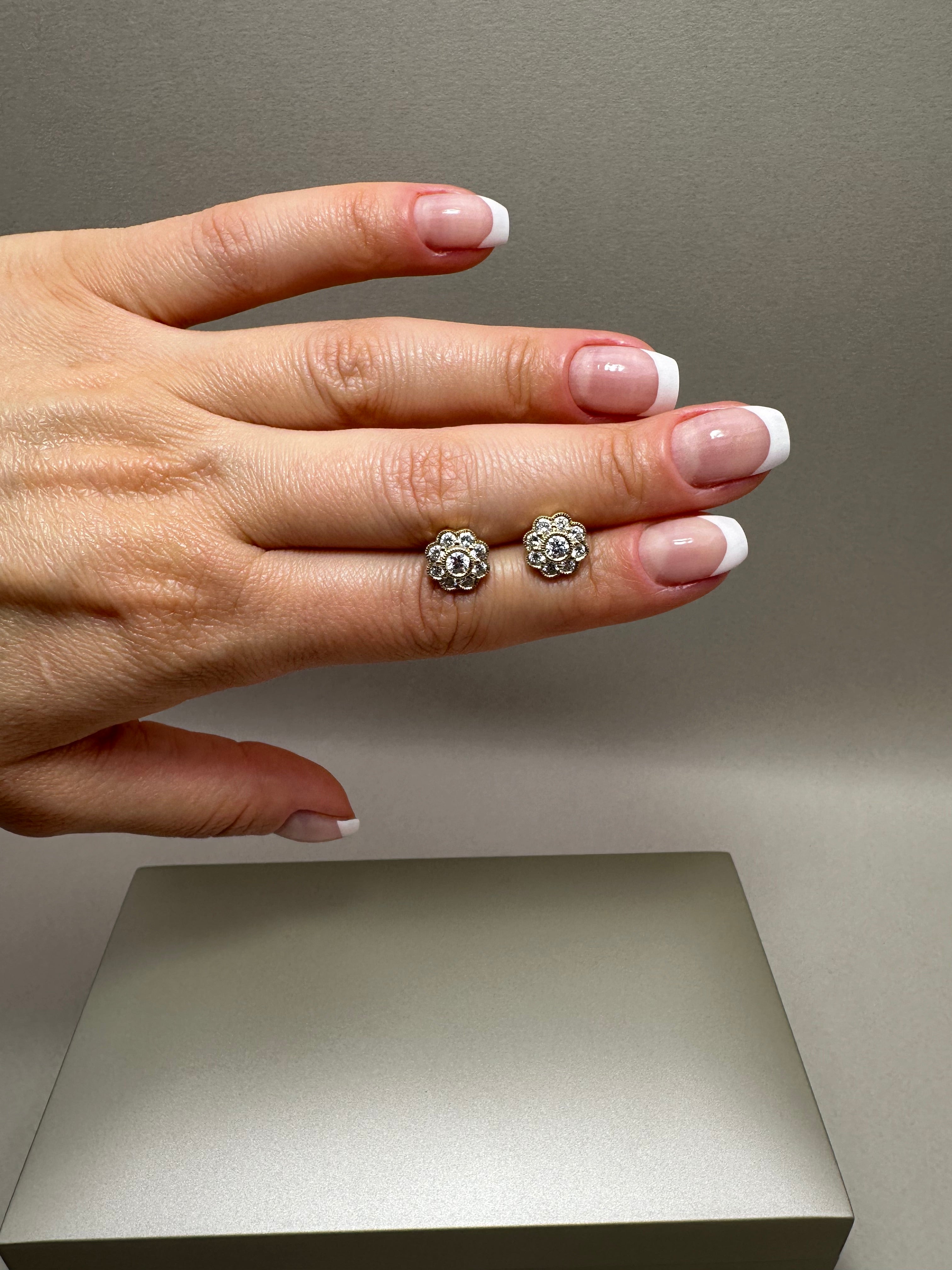 Delicate 9ct yellow gold daisy cluster stud earrings featuring 1.01ct lab-grown round diamonds (E/F-VS quality) with an elegant filigree finish. Measuring approx. 9.3x9.3mm with a depth of 2.7mm, these sustainable diamond earrings offer timeless beauty and everyday sophistication.