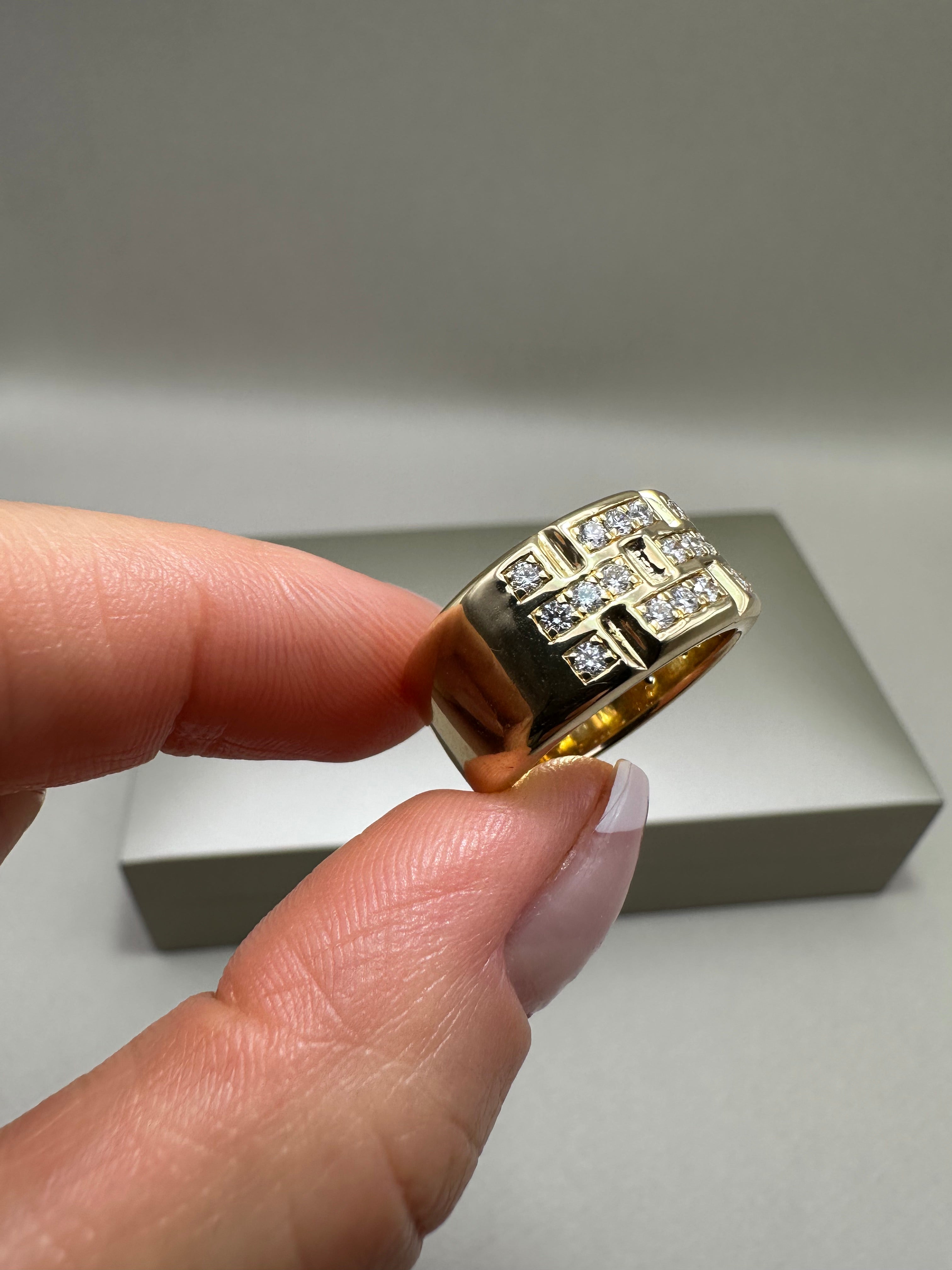 Elegant 9ct yellow gold eternity ring featuring 0.72ct lab-grown round diamonds (E/F-VS quality) in a bold, fancy design. With a wide 9.80mm band, this piece combines timeless sparkle with a contemporary look.