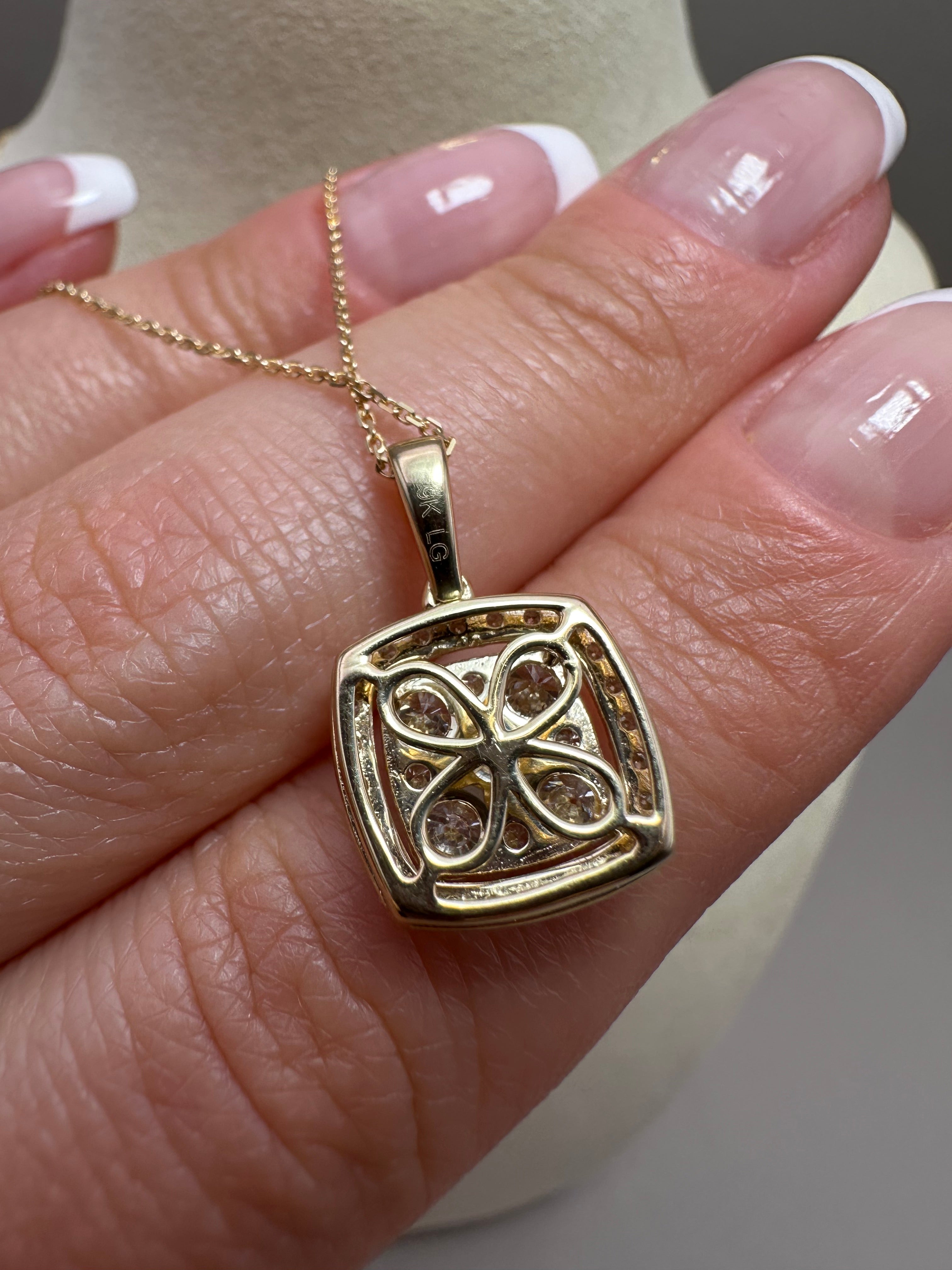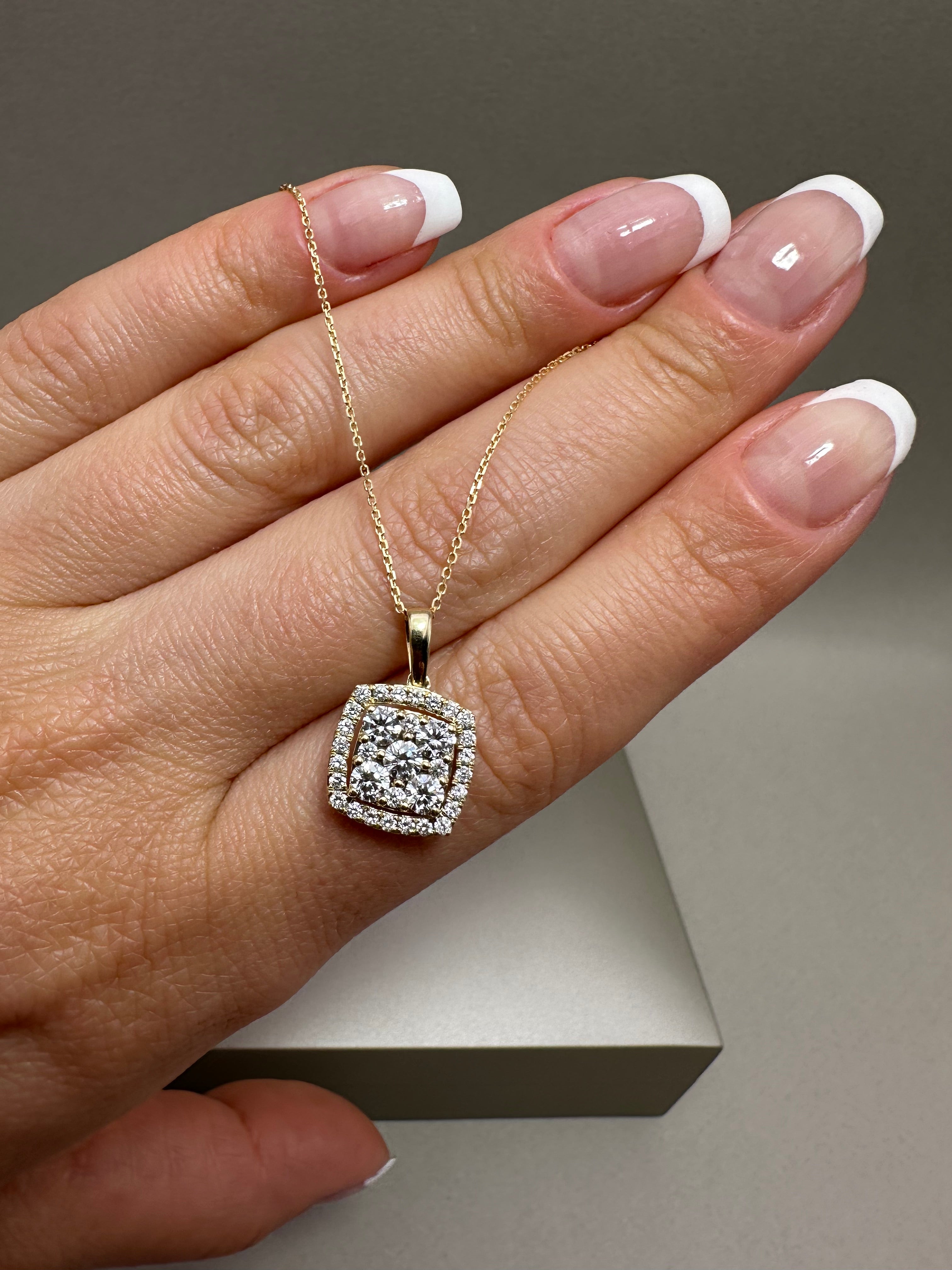 Dazzling 9ct yellow gold halo pendant with 0.90ct lab-grown round diamonds (E/F-VS quality) in an elegant illusion setting. Paired with a 0.40mm fine gold chain, adjustable between 16" and 18". Pendant approx. 11.5x11.5mm, drop 18mm, depth 3.30mm. Ethical sparkle, classic style.