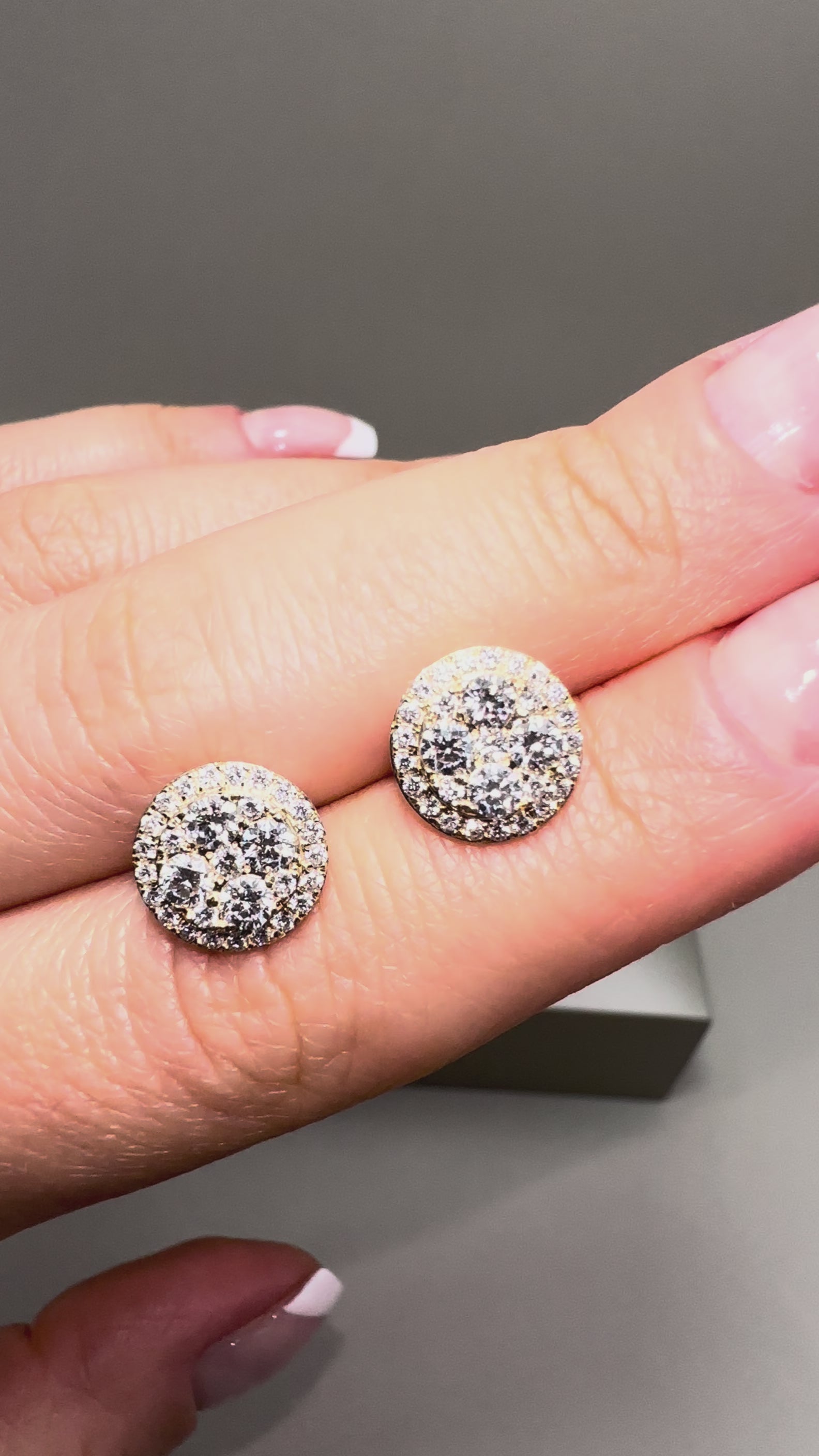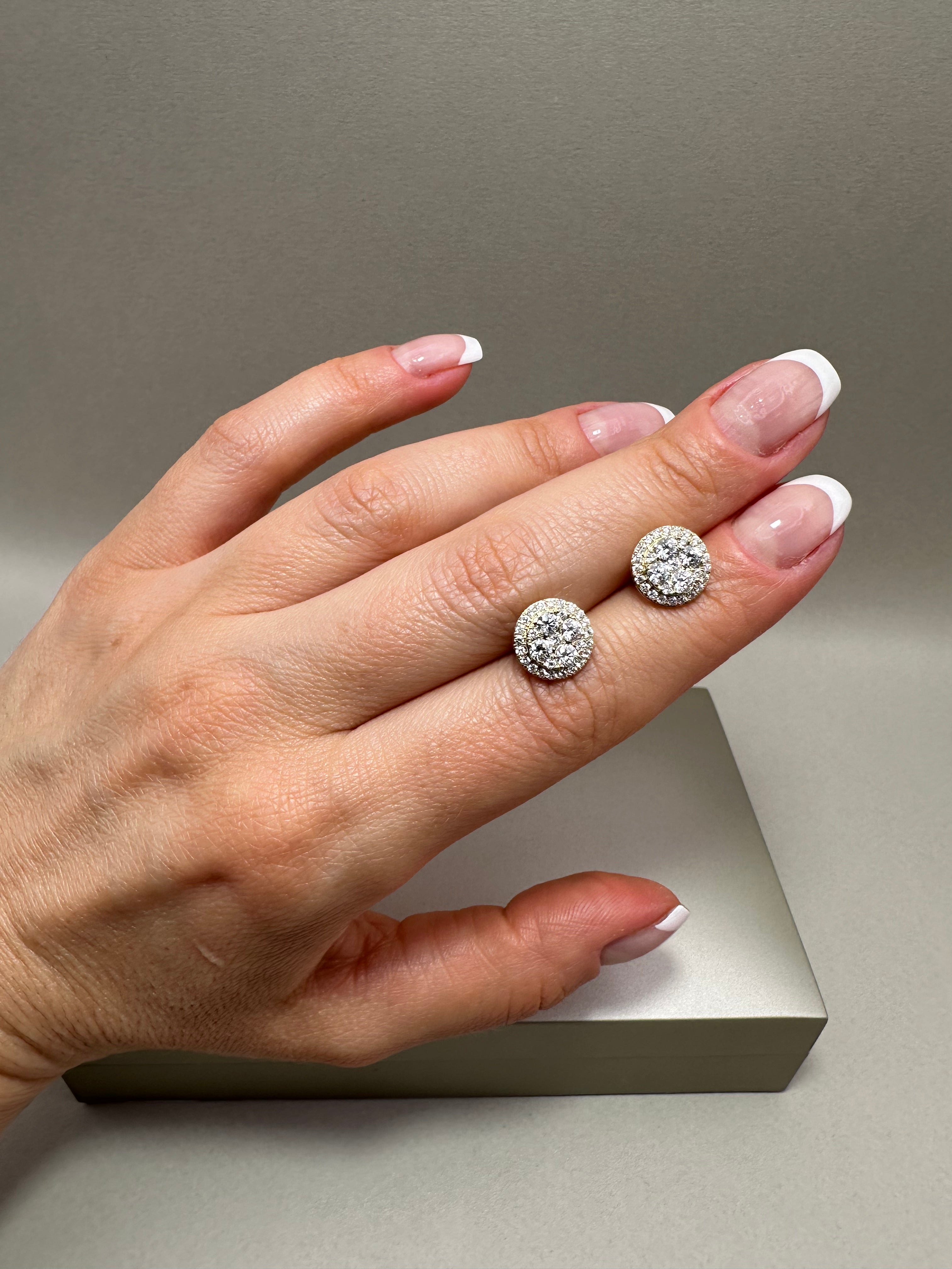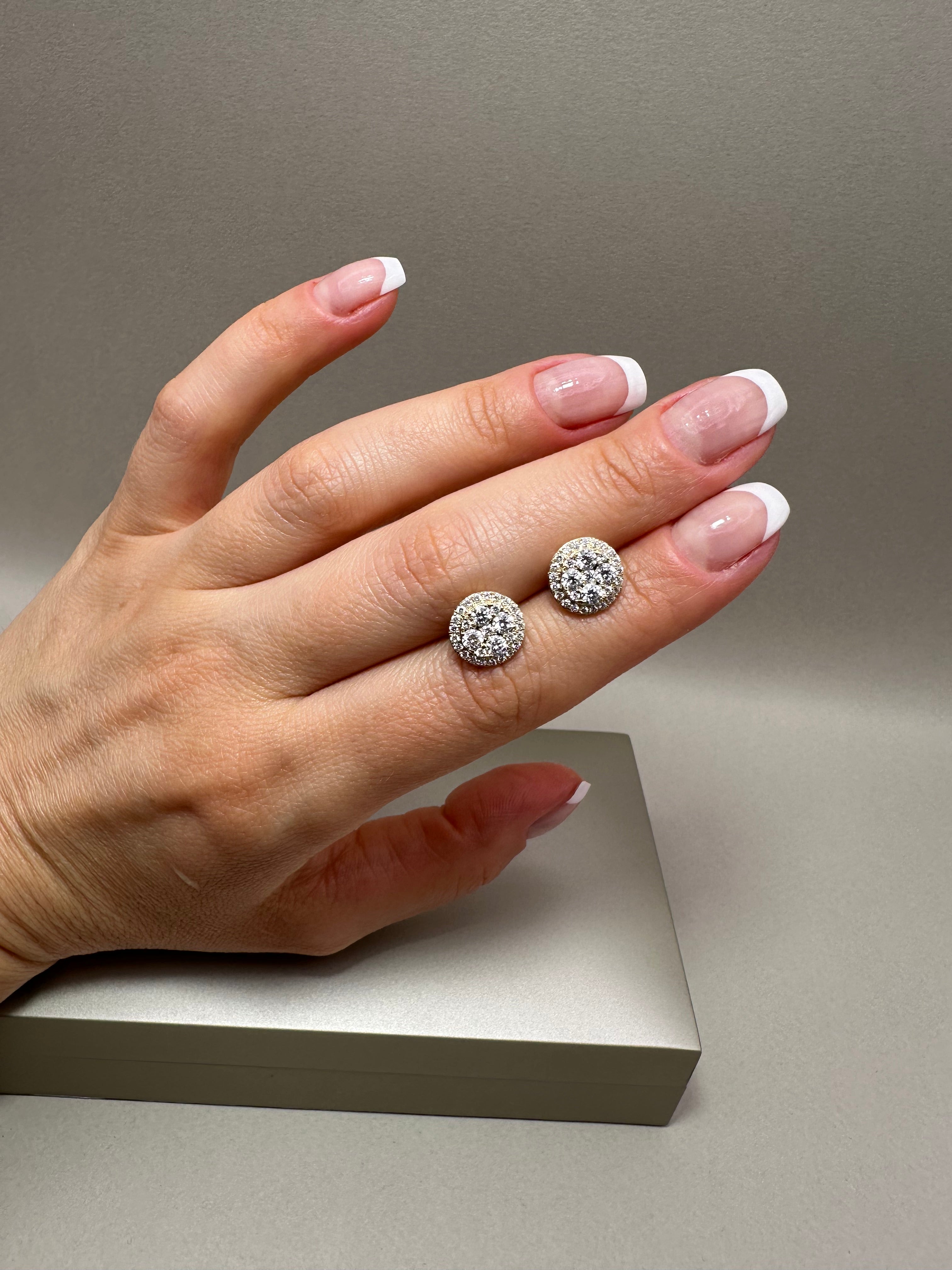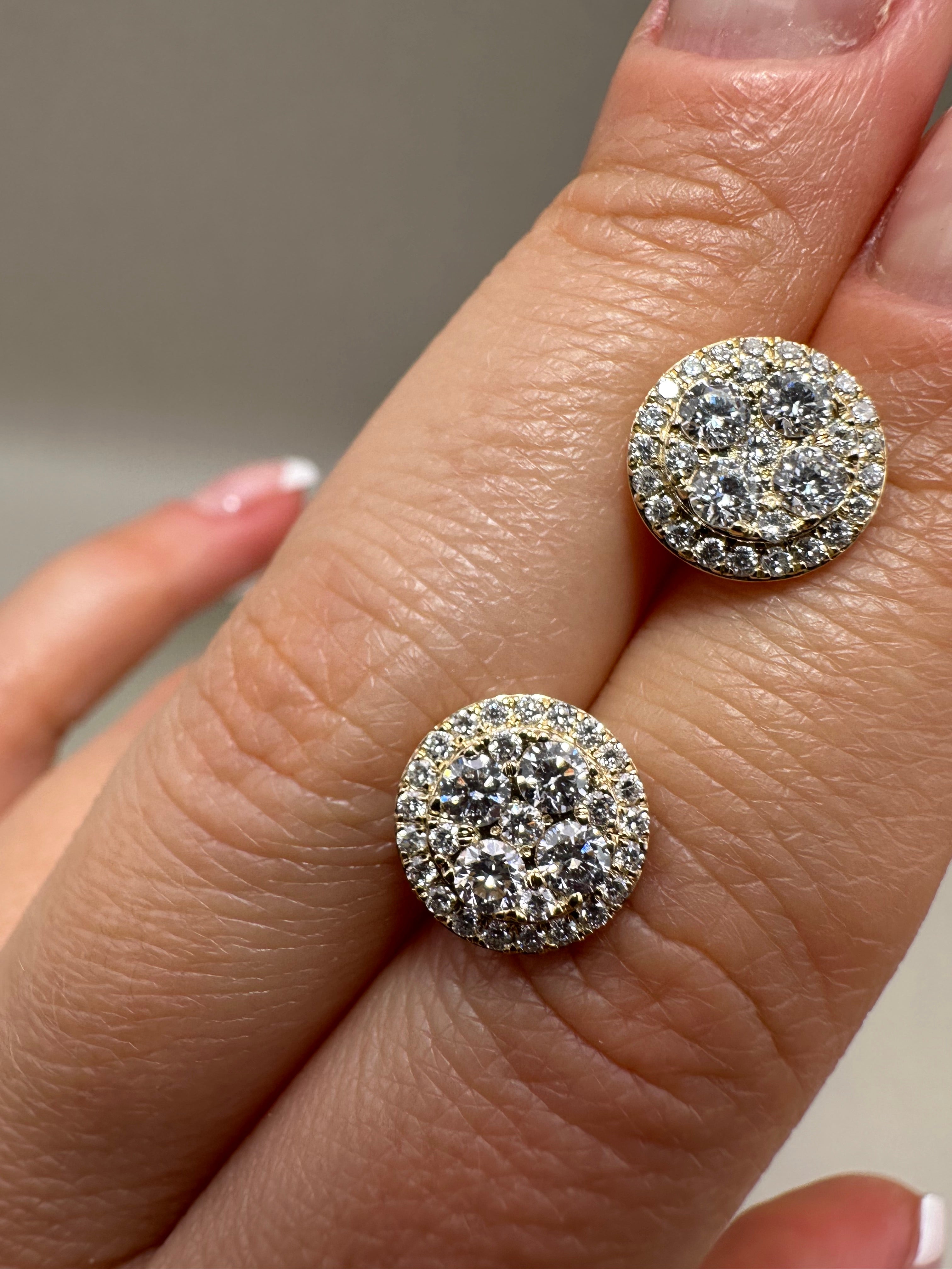 Beautiful 9ct yellow gold halo stud earrings featuring 1.01ct lab-grown round diamonds (E/F-VS quality) set in a dazzling illusion diamond setting. Measuring approx. 10x10mm with a depth of 3.2mm, these sustainable earrings offer elegant sparkle and timeless style.