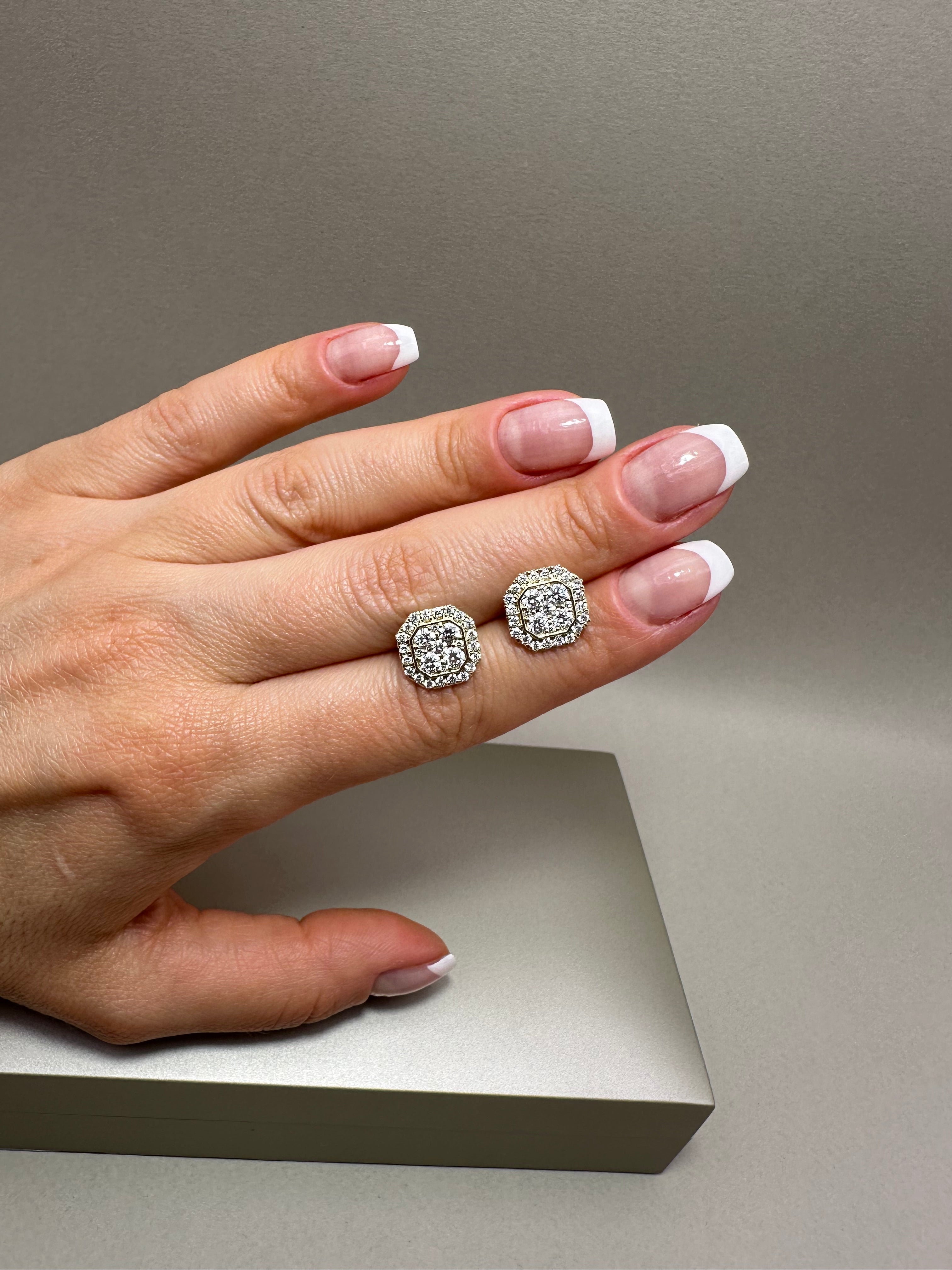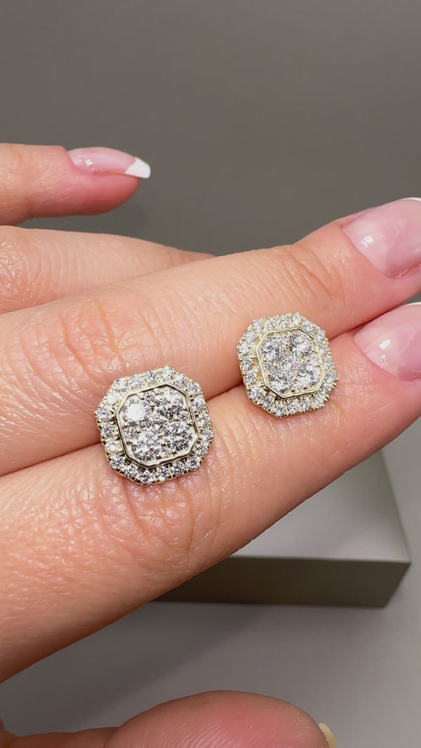 Stunning 9ct yellow gold halo stud earrings featuring 1.44ct lab-grown round diamonds (E/F-VS quality) in a radiant illusion diamond setting. Measuring approx. 11x11mm with a depth of 4mm, these sustainable earrings offer luxurious sparkle and timeless style.