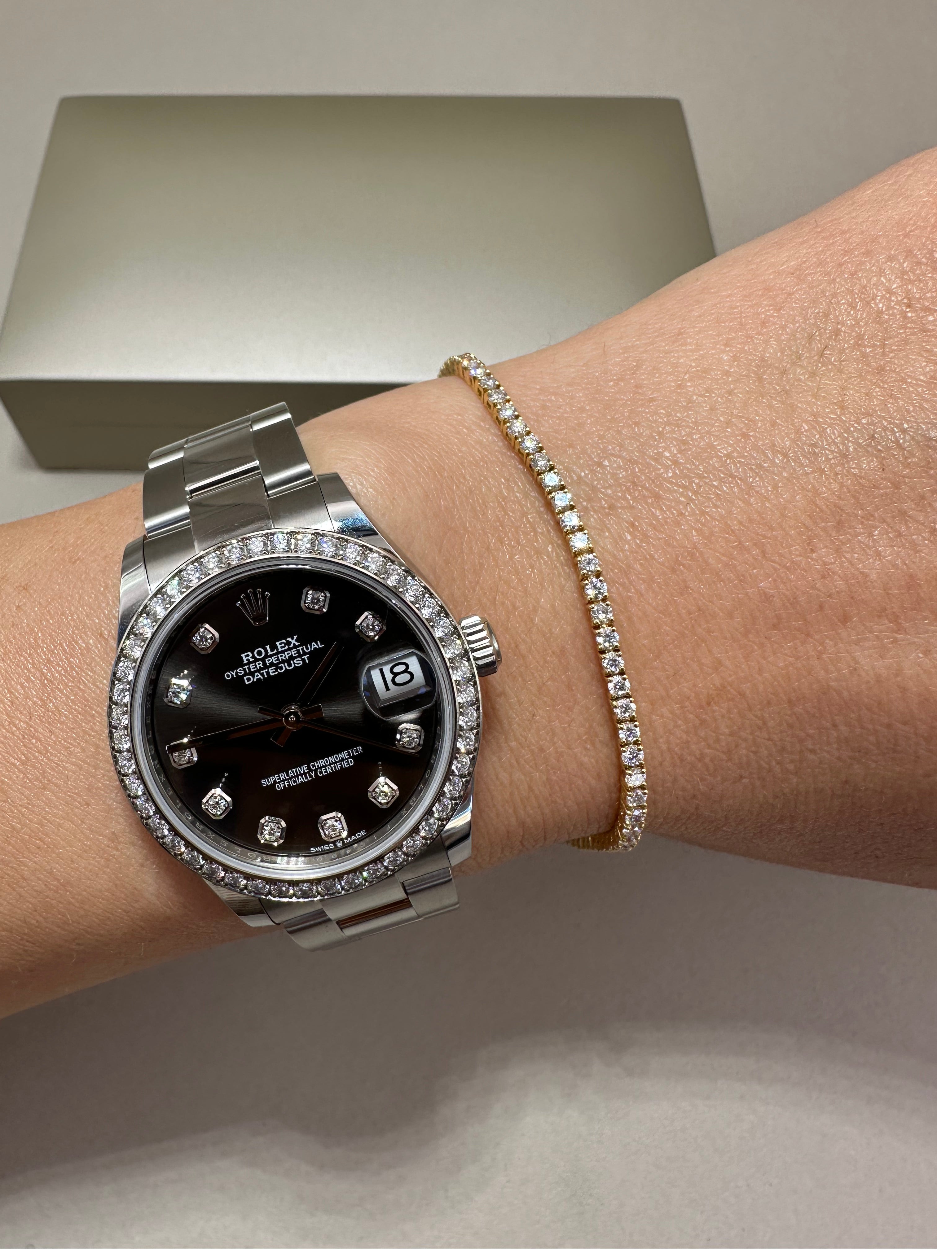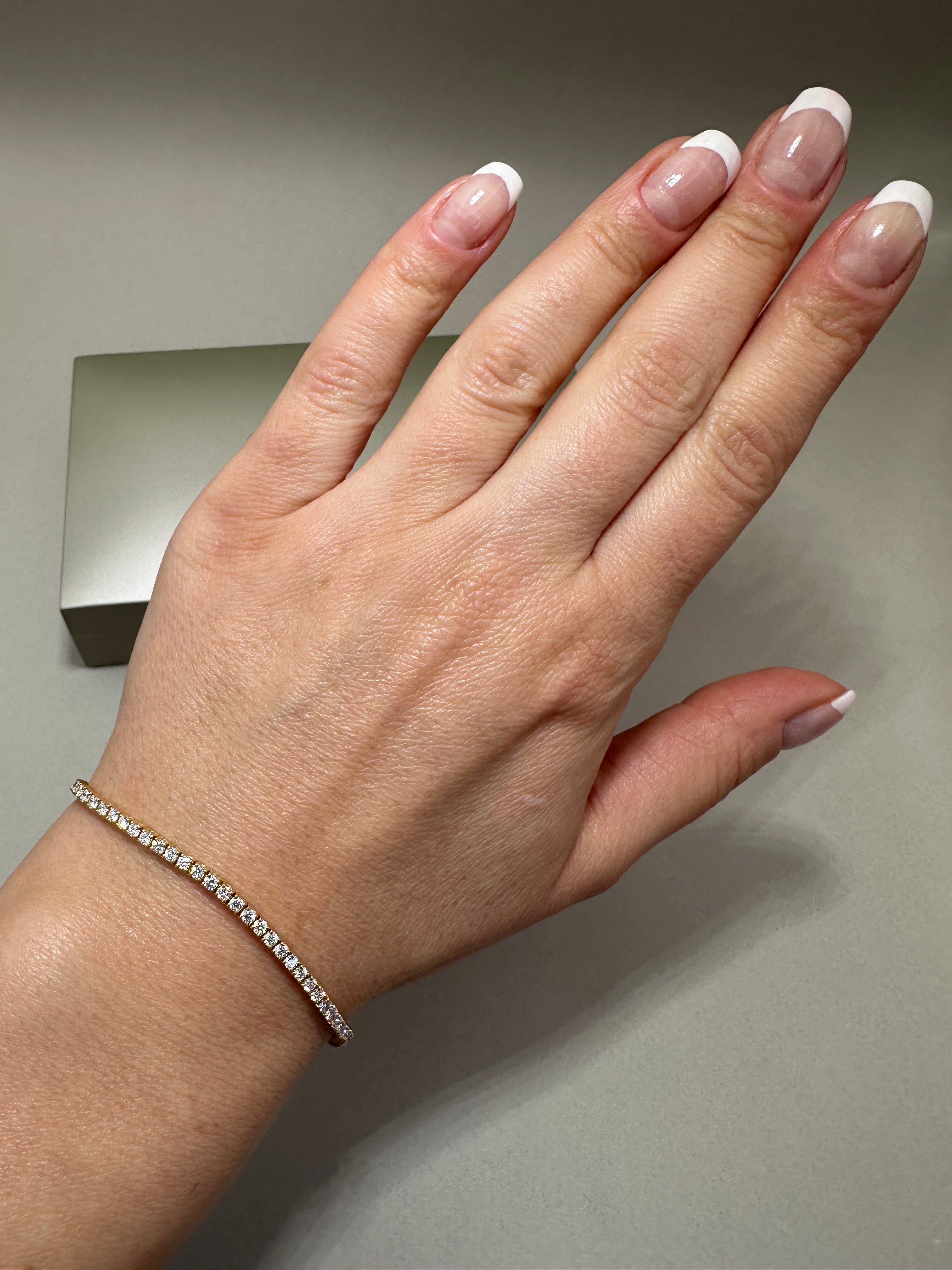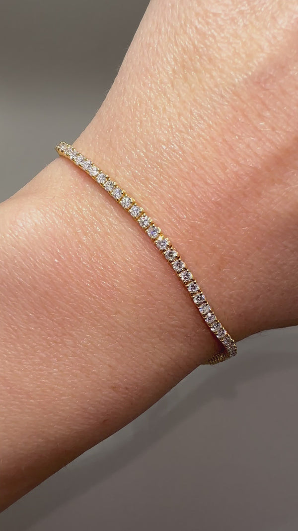 Elegant 9ct yellow gold classic tennis bracelet featuring 2.13ct lab-grown round cut diamonds. Perfect for women’s fine jewellery, engagement gifts, anniversary presents, or everyday luxury. This ethically crafted, sustainable diamond bracelet offers timeless style with a delicate 1.8mm band width and 7" length. Ideal for stacking or as a standalone statement piece.