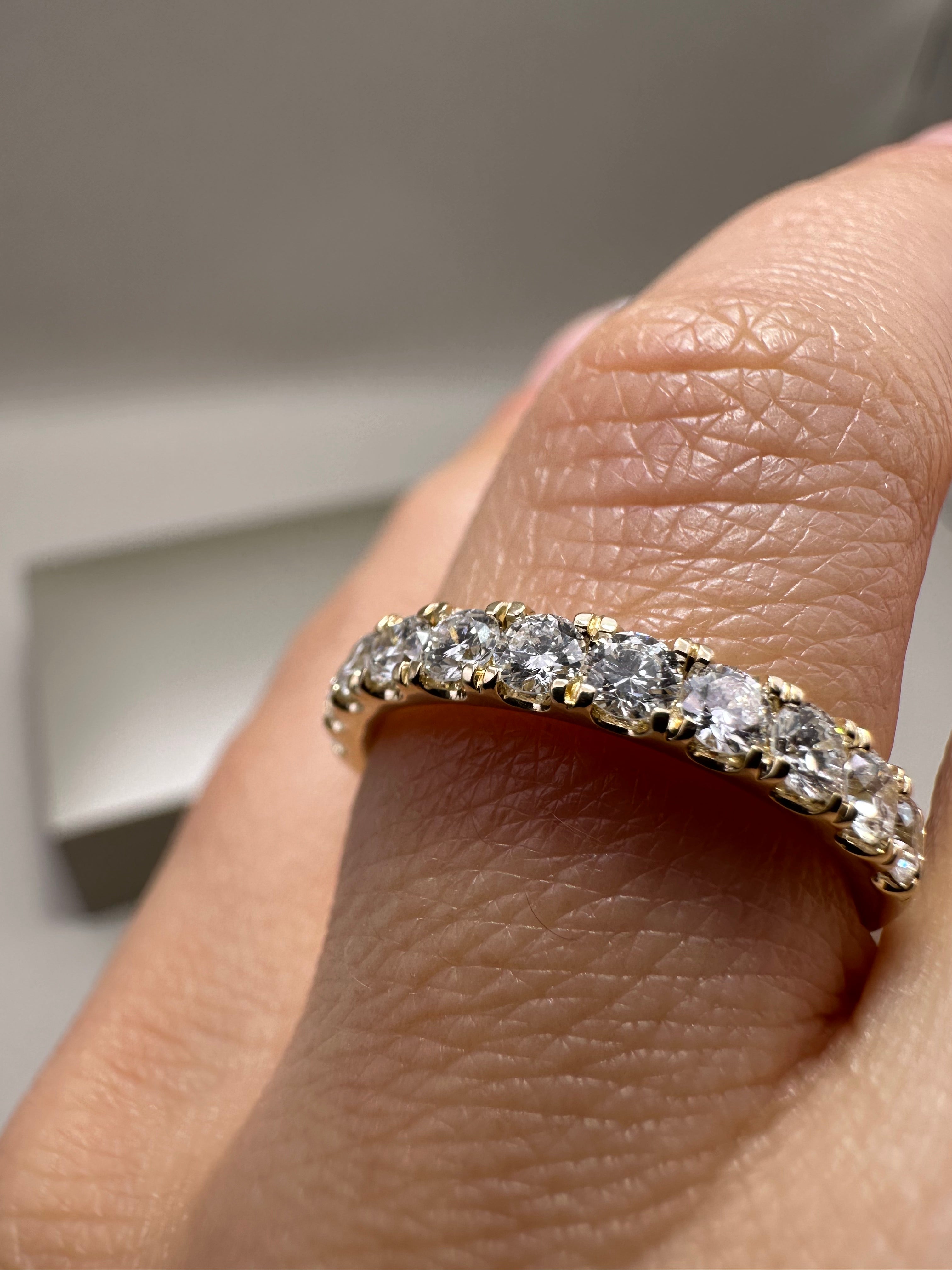 This exquisite 9ct yellow gold half eternity ring features 0.81ct of sparkling lab-grown round diamonds, offering brilliance with an ethical and sustainable touch. The 3mm band provides comfortable everyday wear while showcasing modern elegance. Perfect for those seeking fine jewellery crafted with care for the environment.