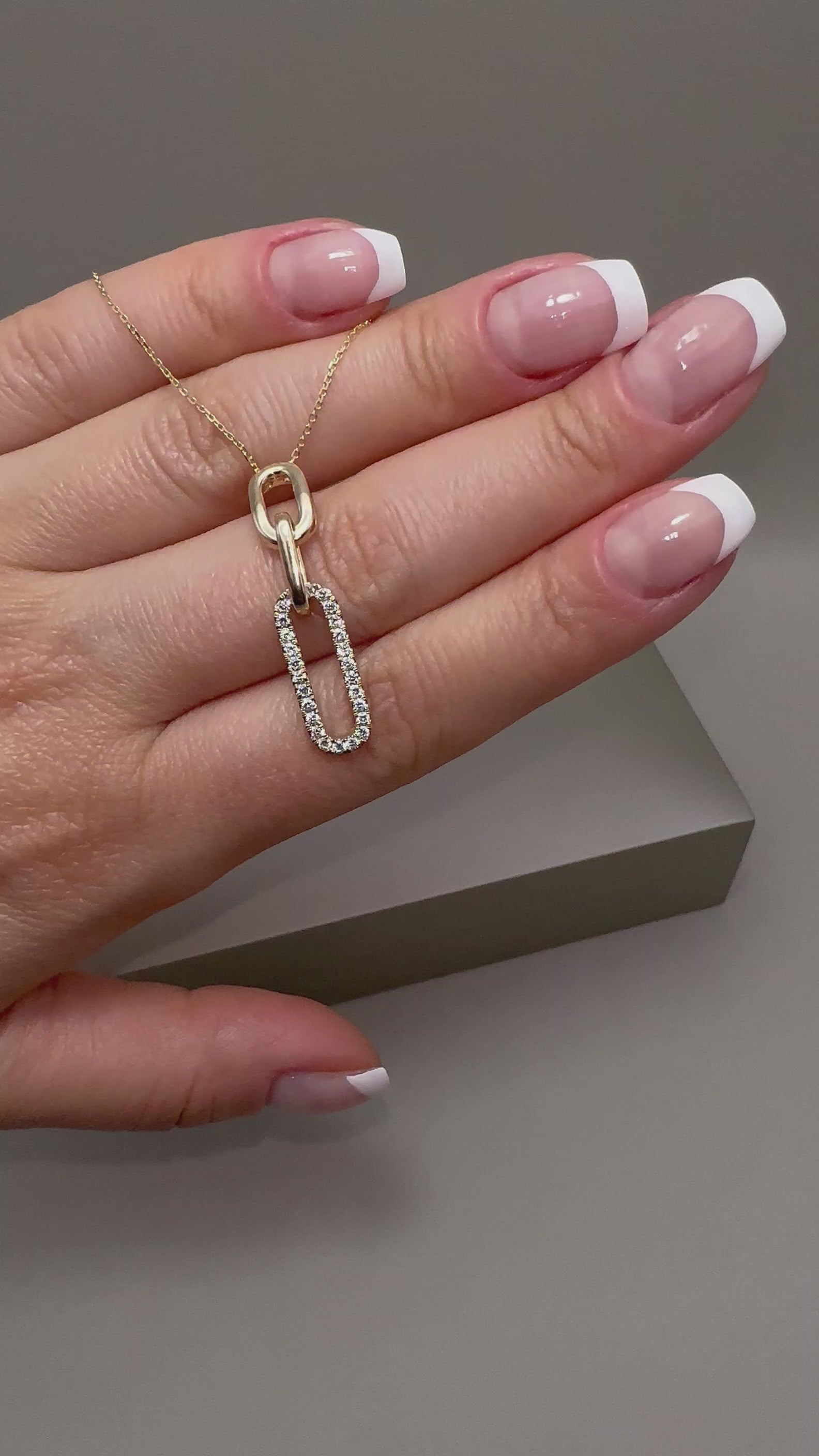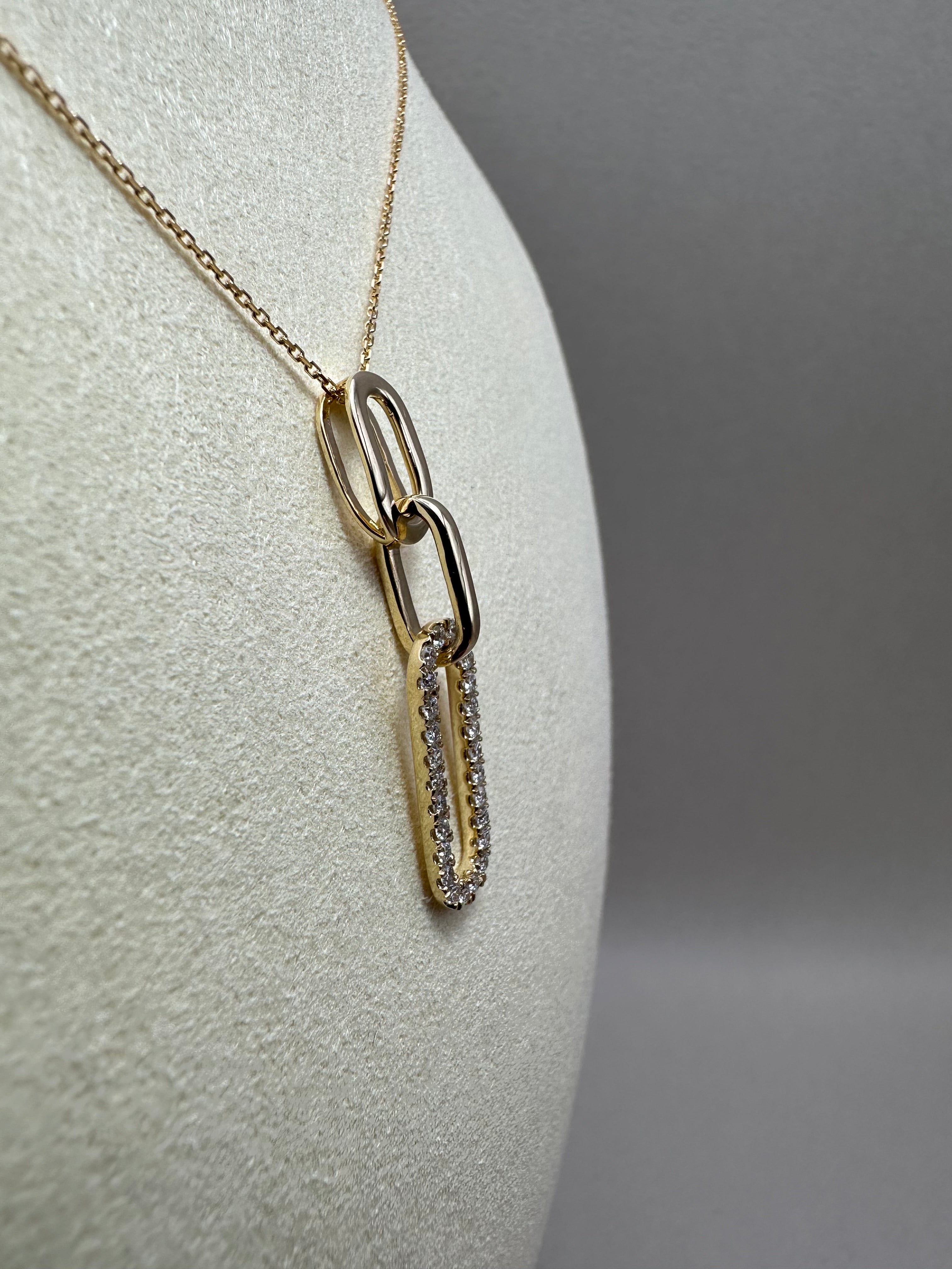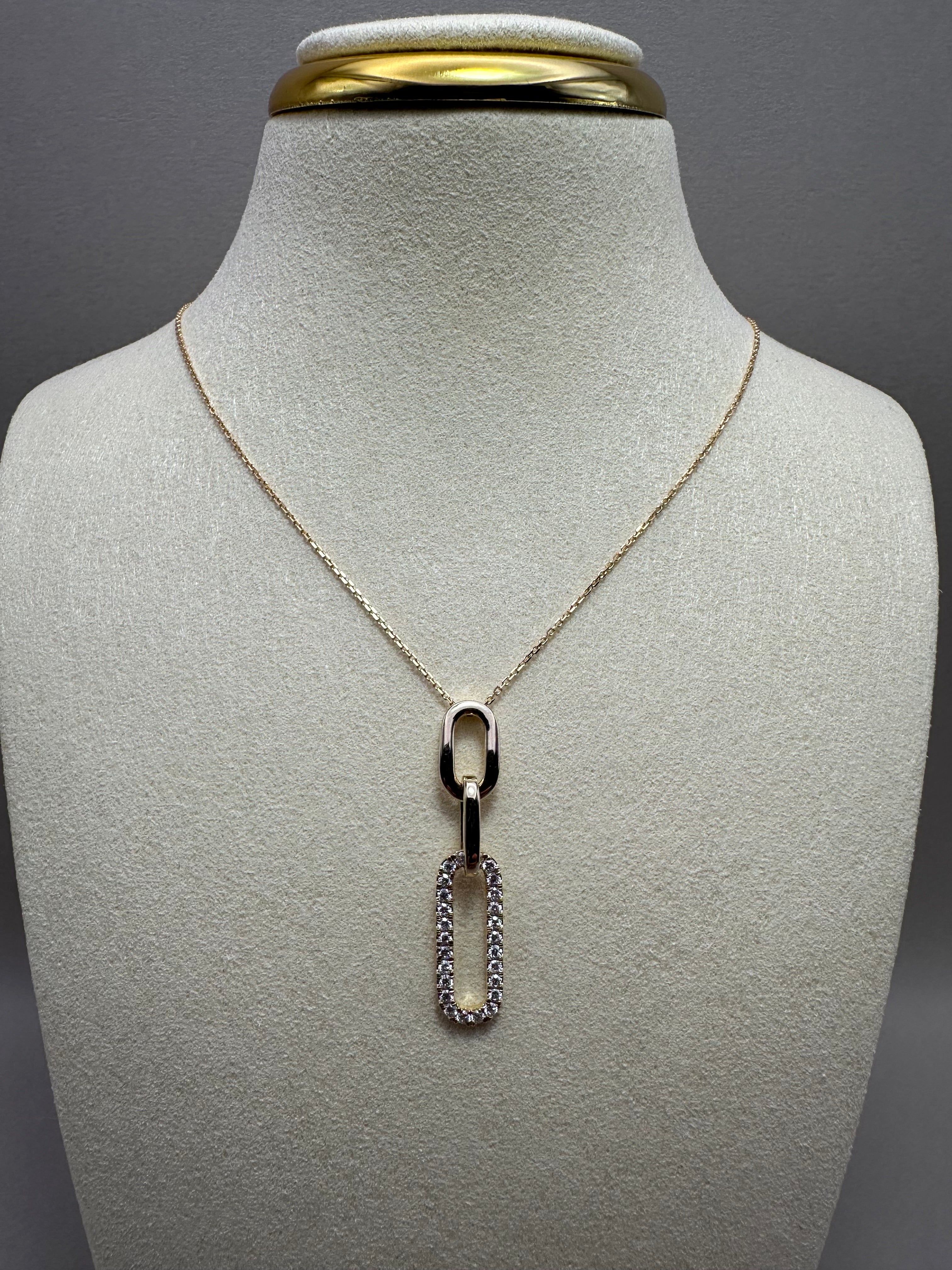 Modern 9ct yellow gold paperclip pendant adorned with 0.32ct lab-grown round diamonds (E/F-VS quality). Paired with a 0.40mm fine gold chain adjustable from 16" to 18". Pendant size approx. 35x7mm, drop 35mm, depth 3.20mm. Sleek, contemporary style with sustainable sparkle.