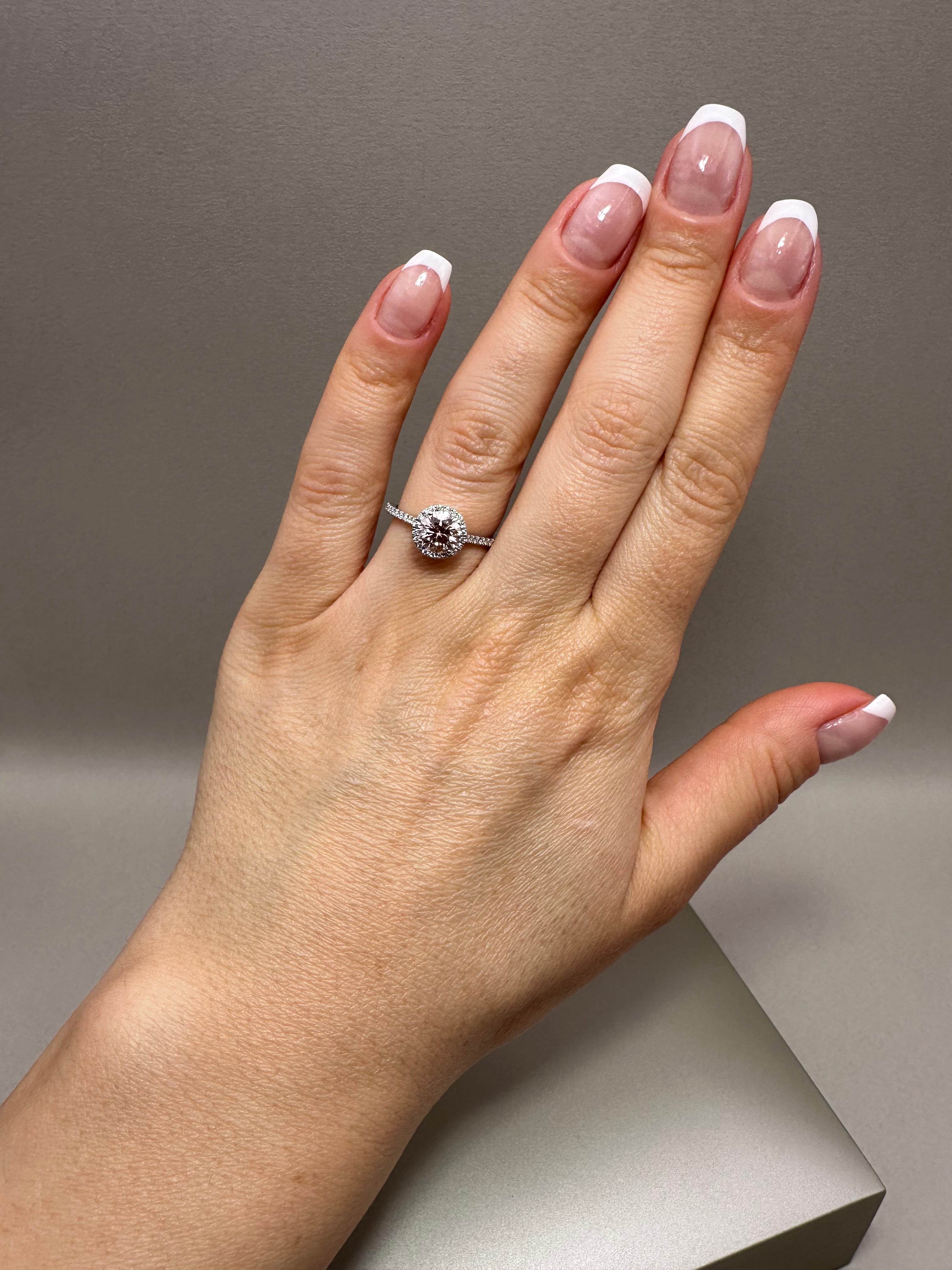 Discover this stunning platinum halo ring featuring a 1.04ct round cut lab-grown pink diamond with VS clarity, accented by 0.22ct round D/VS diamonds. Totaling 1.26ct, set on a delicate 1.4mm platinum band, this ring combines elegance with sustainable craftsmanship.